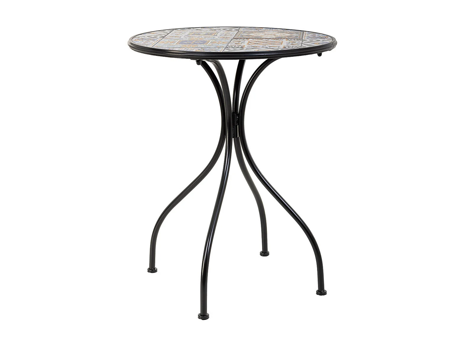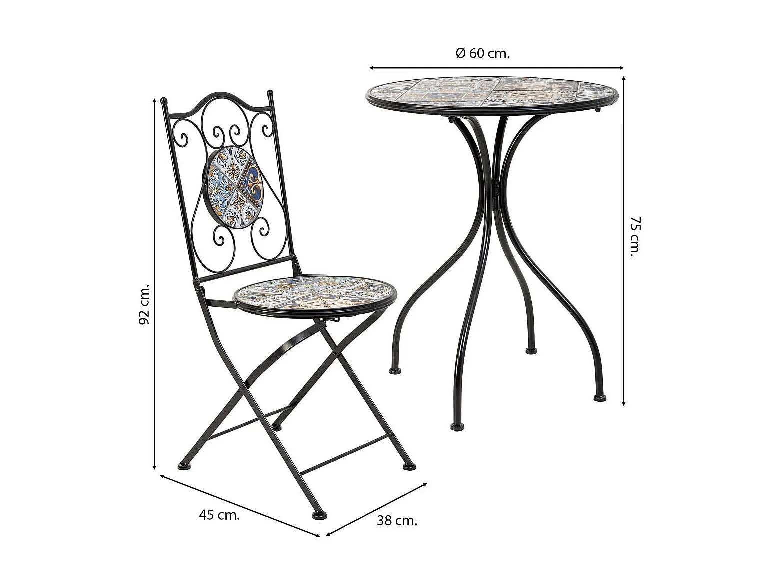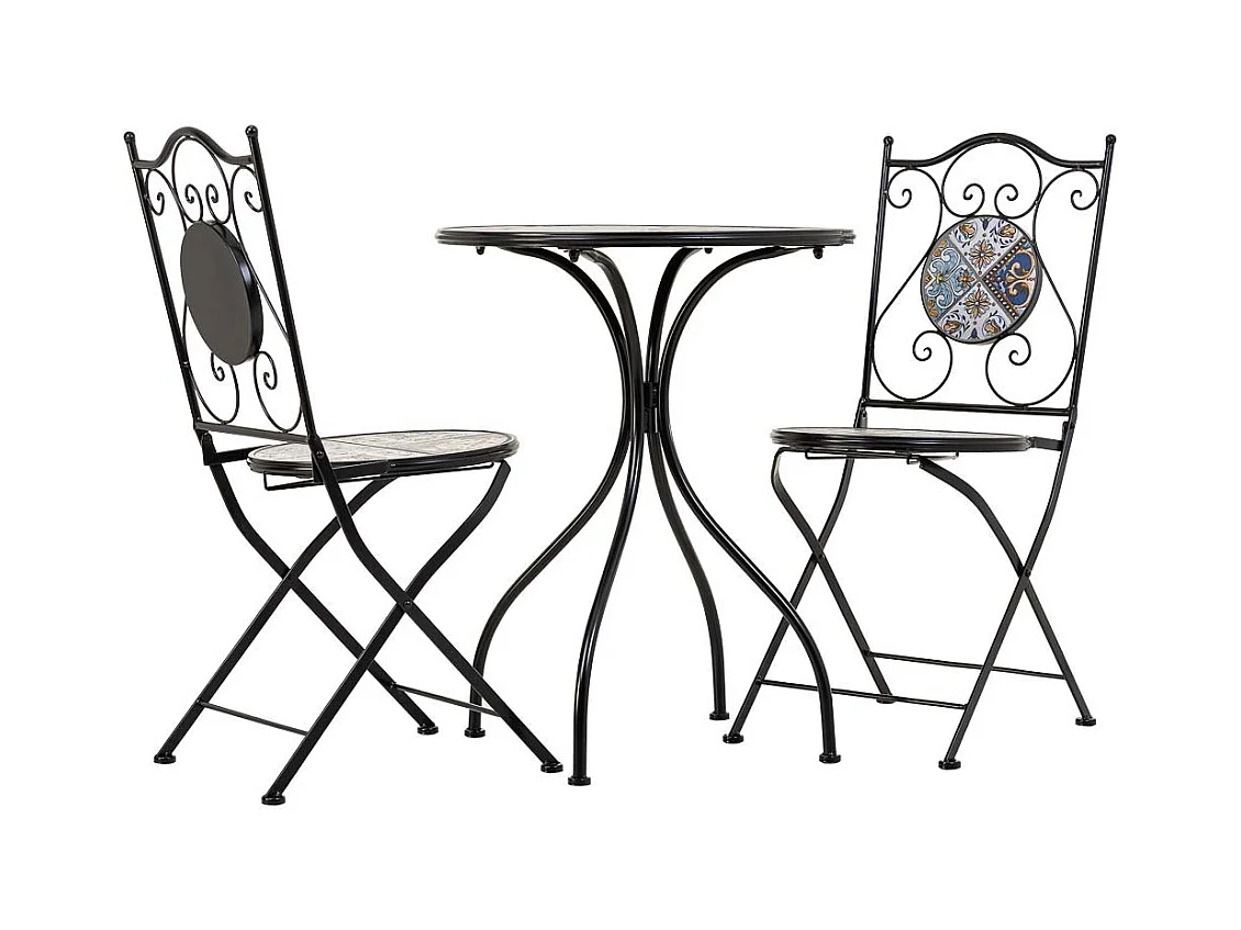 Conjunto de mesa e duas cadeiras em mosaico preto e ferro forjado