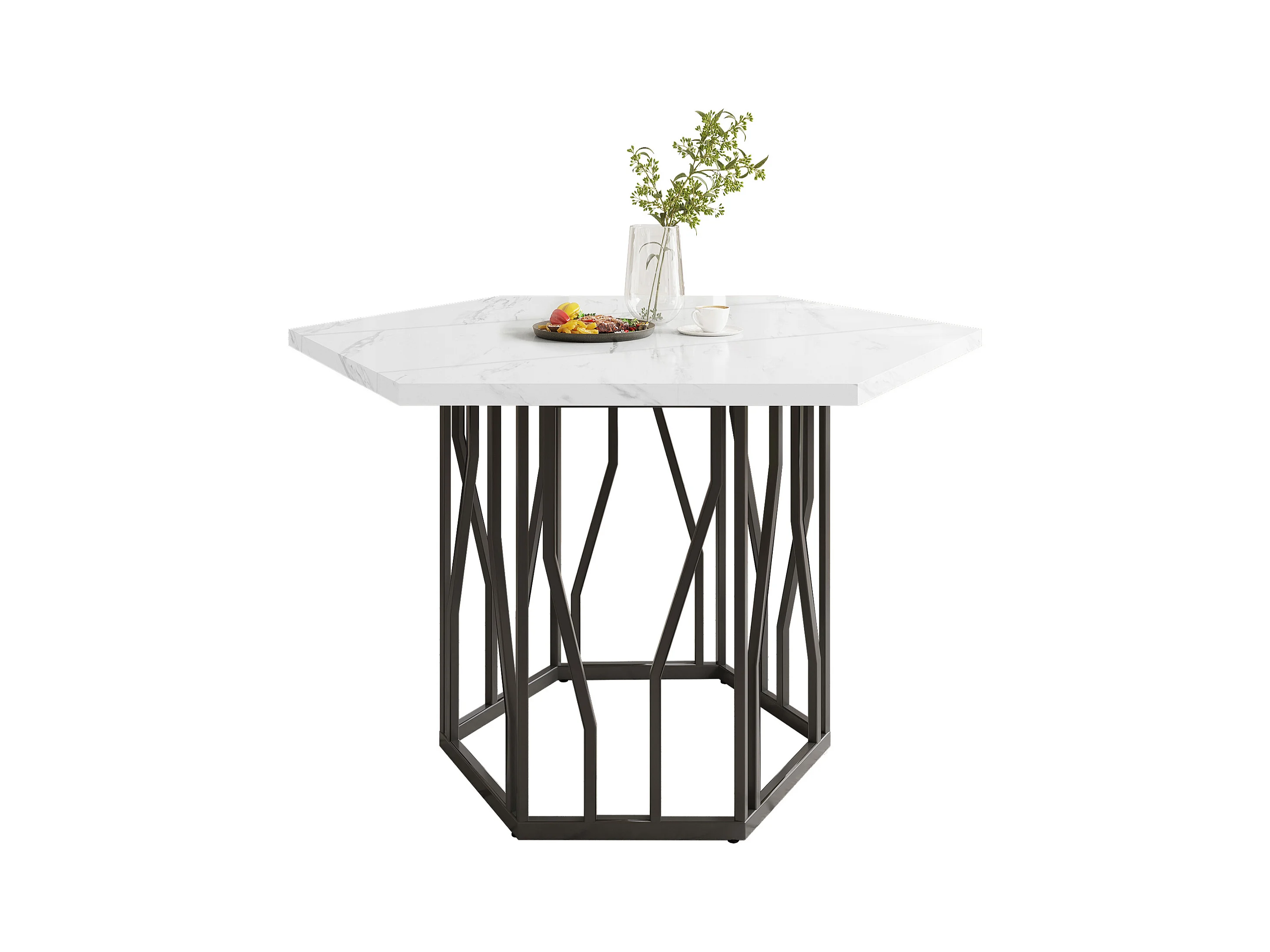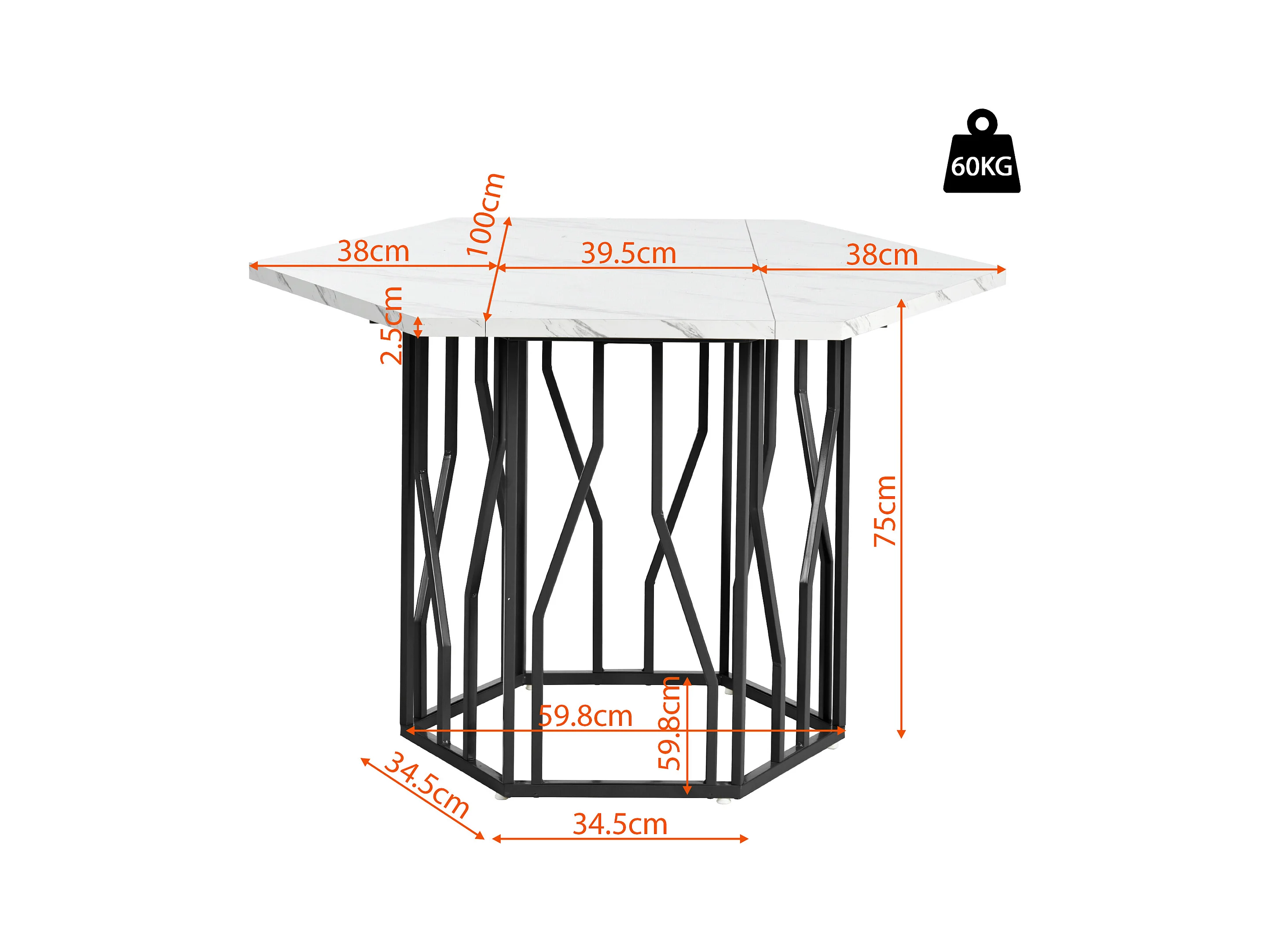 Mesa de jantar hexagonal com efeito mármore branco 115x100 cm com 4 cadeiras de veludo preto com pernas douradas