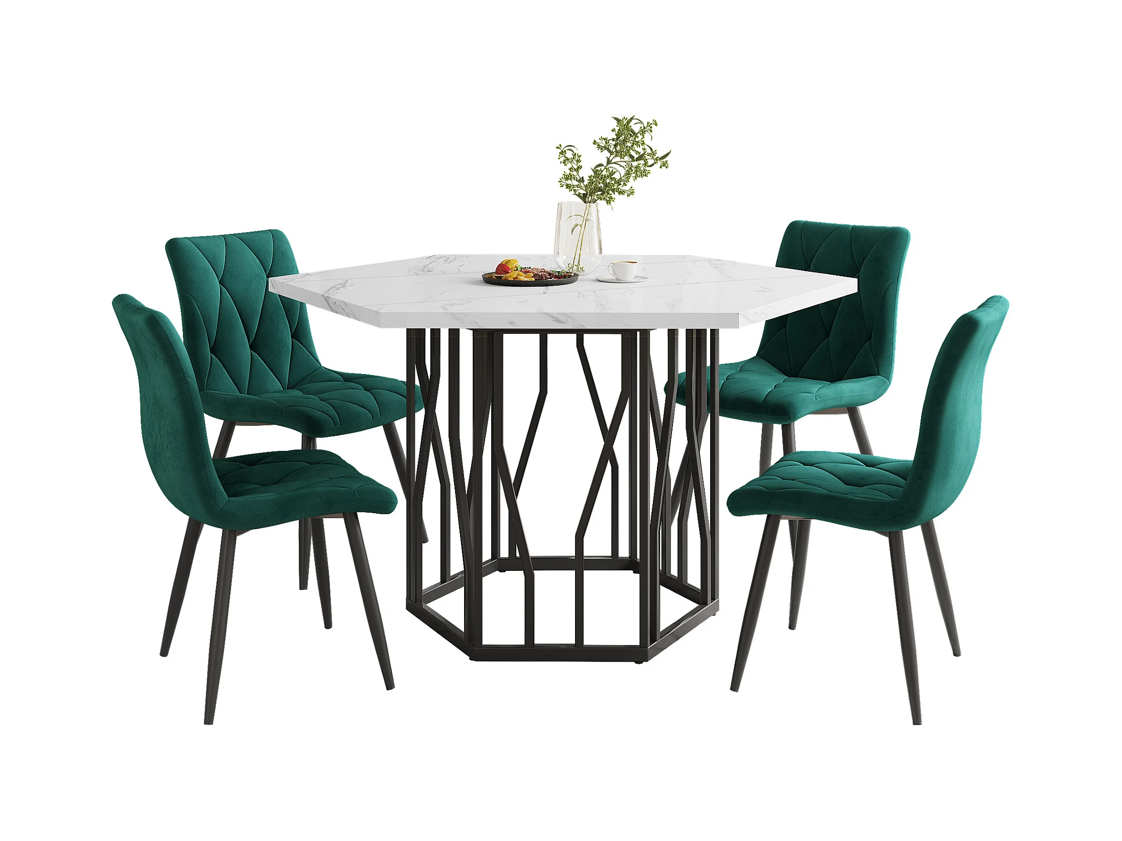 Conjunto de mesa hexagonal de mármore 115,5x100 cm MDF metal + 4 cadeiras de jantar de veludo verde
