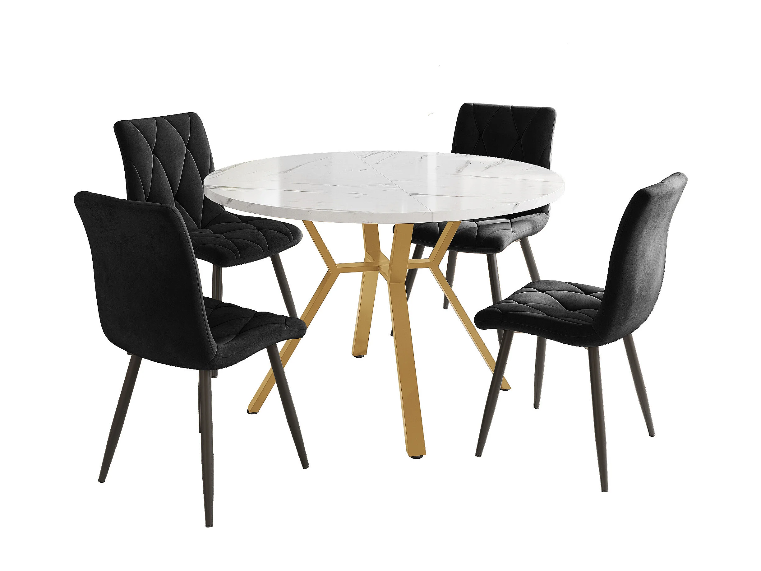 Conjunto de mesa redonda de MDF com efeito mármore de 100 cm com 4 cadeiras de veludo preto e pernas de metal dourado