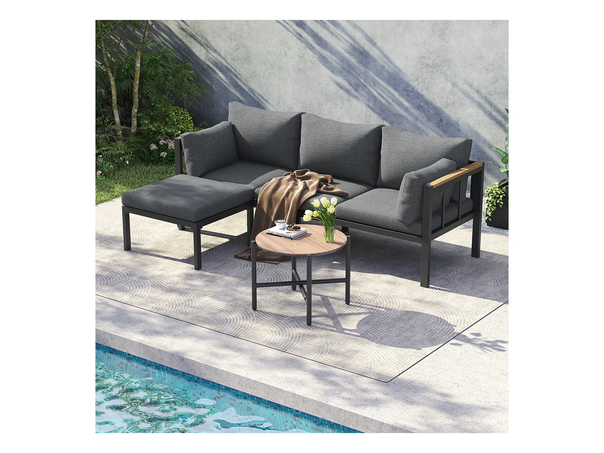 Conjunto de mobiliário de jardim modular de 4 lugares em aço galvanizado: 1 sofá de 3 lugares + 1 banco + 1 mesa de centro redonda - Cinza