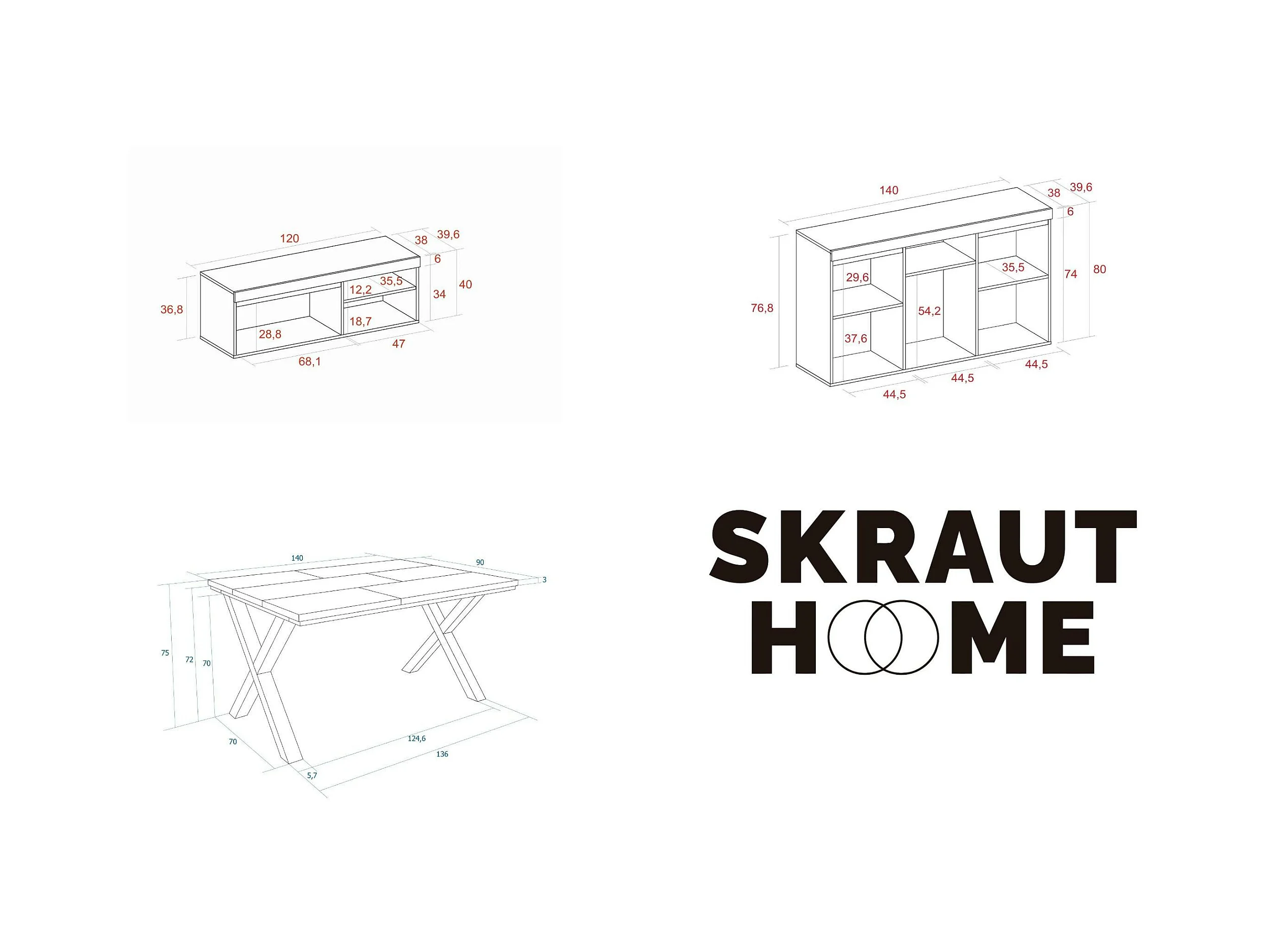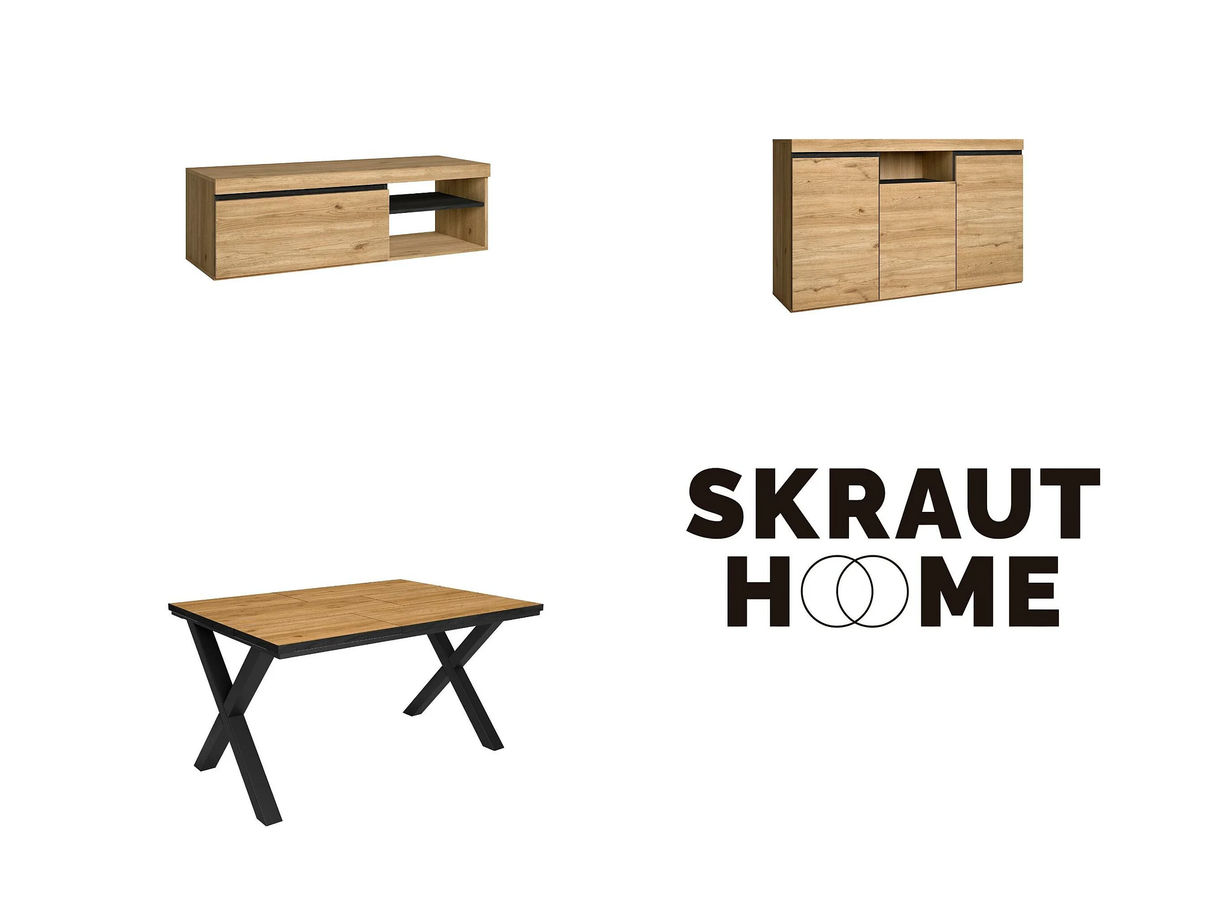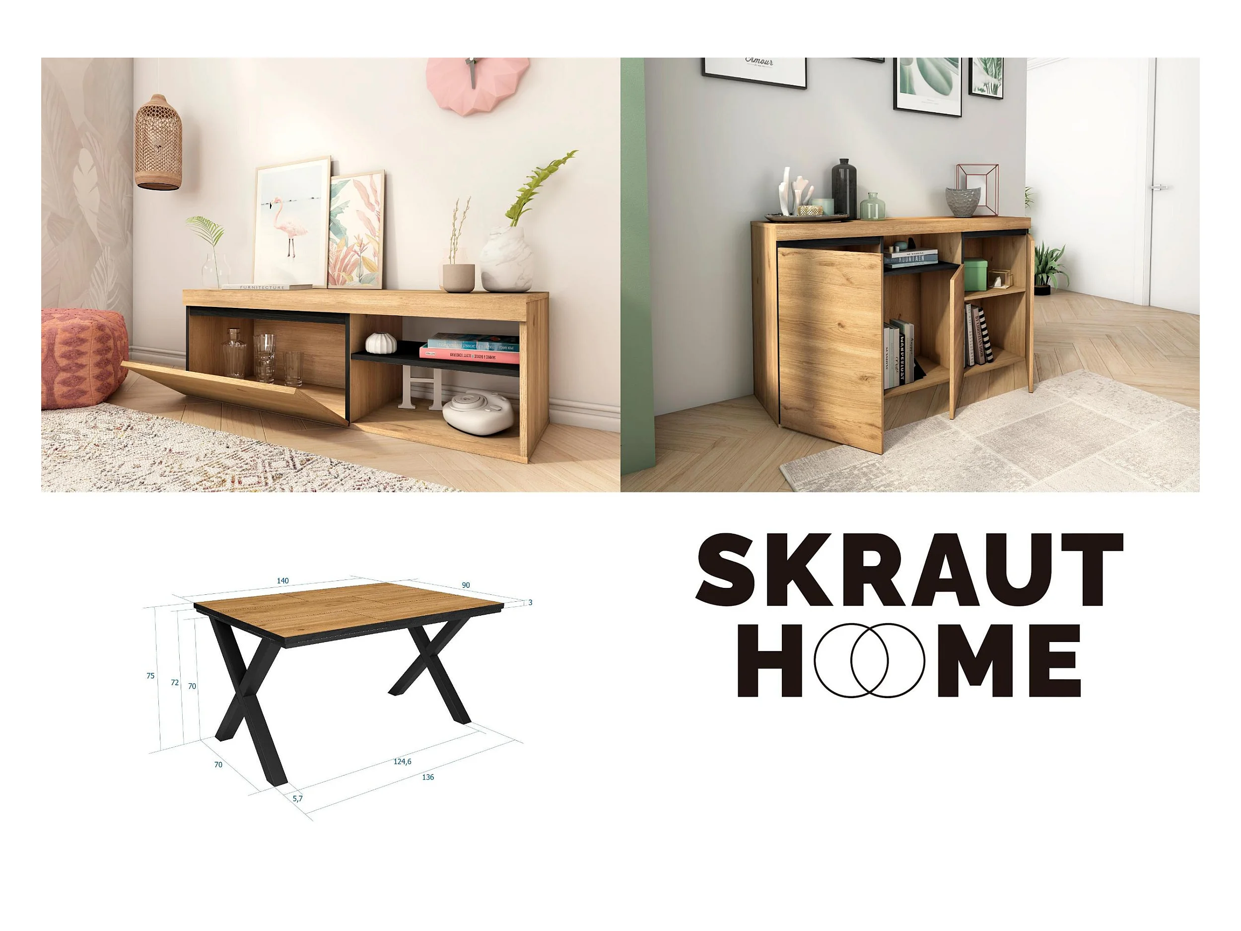 Conjunto de mobiliário para sala de estar, Mesa 140 Borda preta pés X 6 pessoas, Suporte TV120, Aparador / Buffet140, Carvalho,Preto