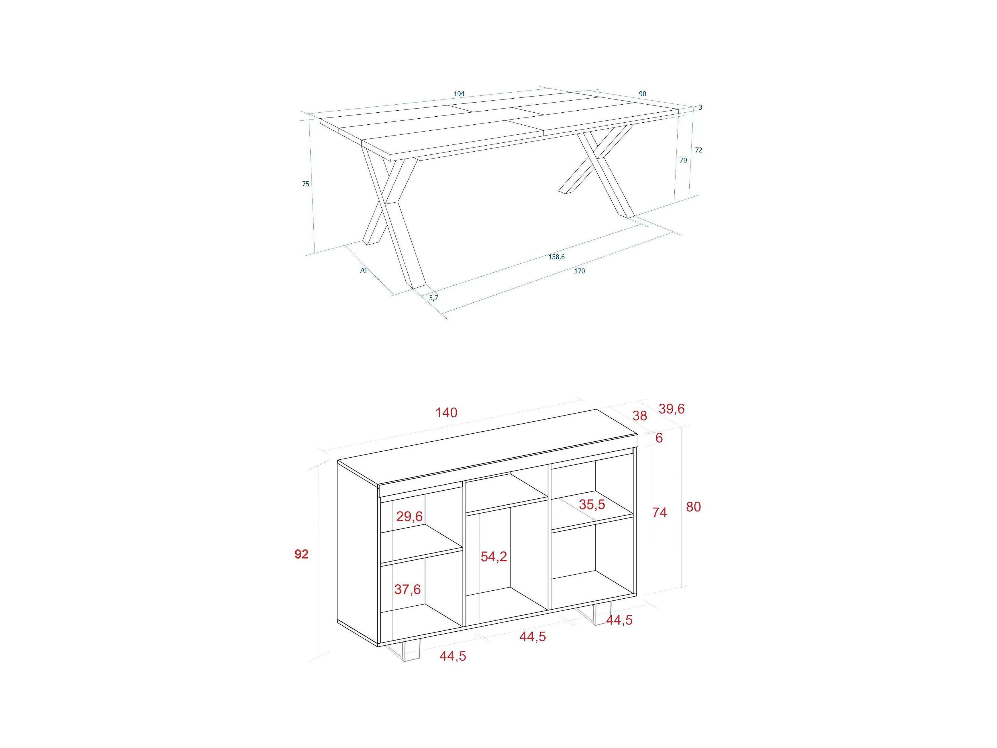Conjunto de mobiliário para sala de estar, Mesa 200 Bicolor pés X 10 pessoas, Suporte TV 140, Aparador / Buffet 140, Carvalho, Preto