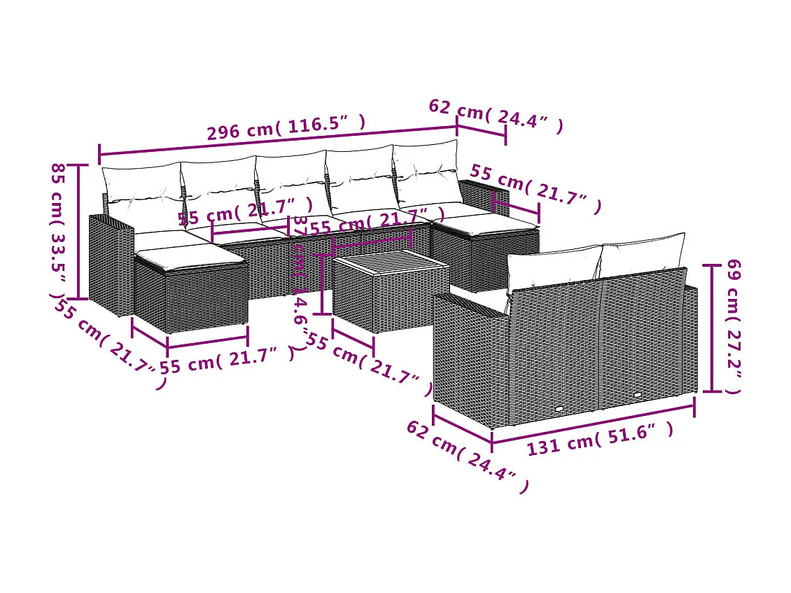 Conjunto de móveis de jardim com almofadas 9 peças resina de vime marrom