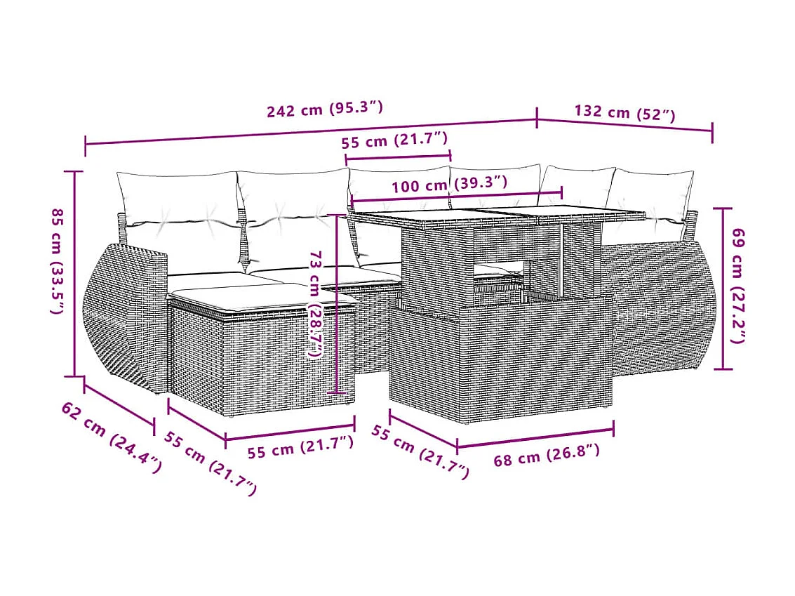 Conjunto de móveis de jardim com almofadas 7 peças resina de vime marrom