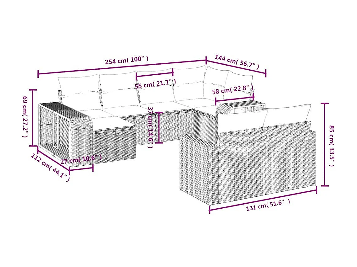 Conjunto de móveis de jardim de 10 peças com almofadas marrons em resina trançada