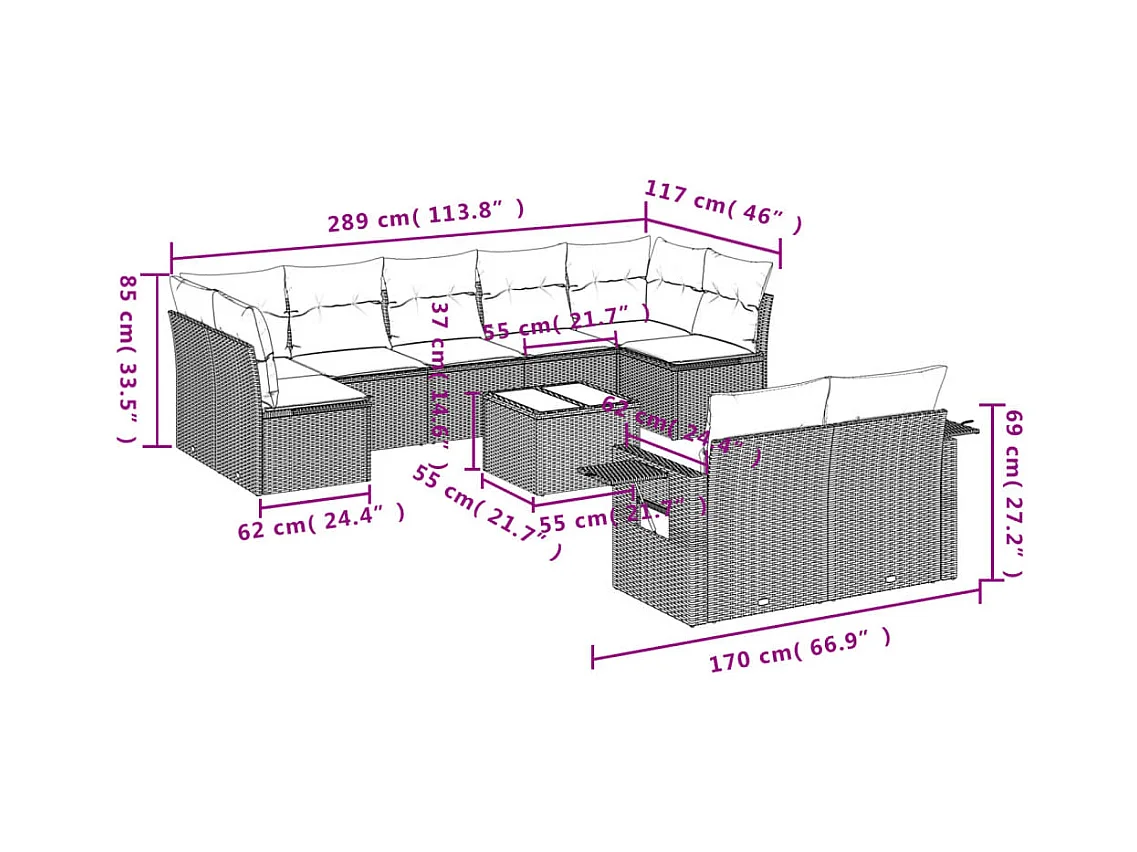 Conjunto de móveis de jardim de 10 peças com almofadas marrons em resina trançada