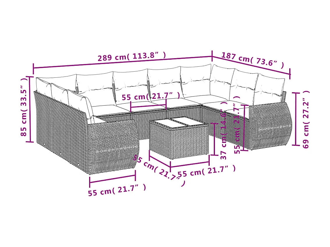 Conjunto de sofá de jardim de 11 peças com almofadas de vime de acácia