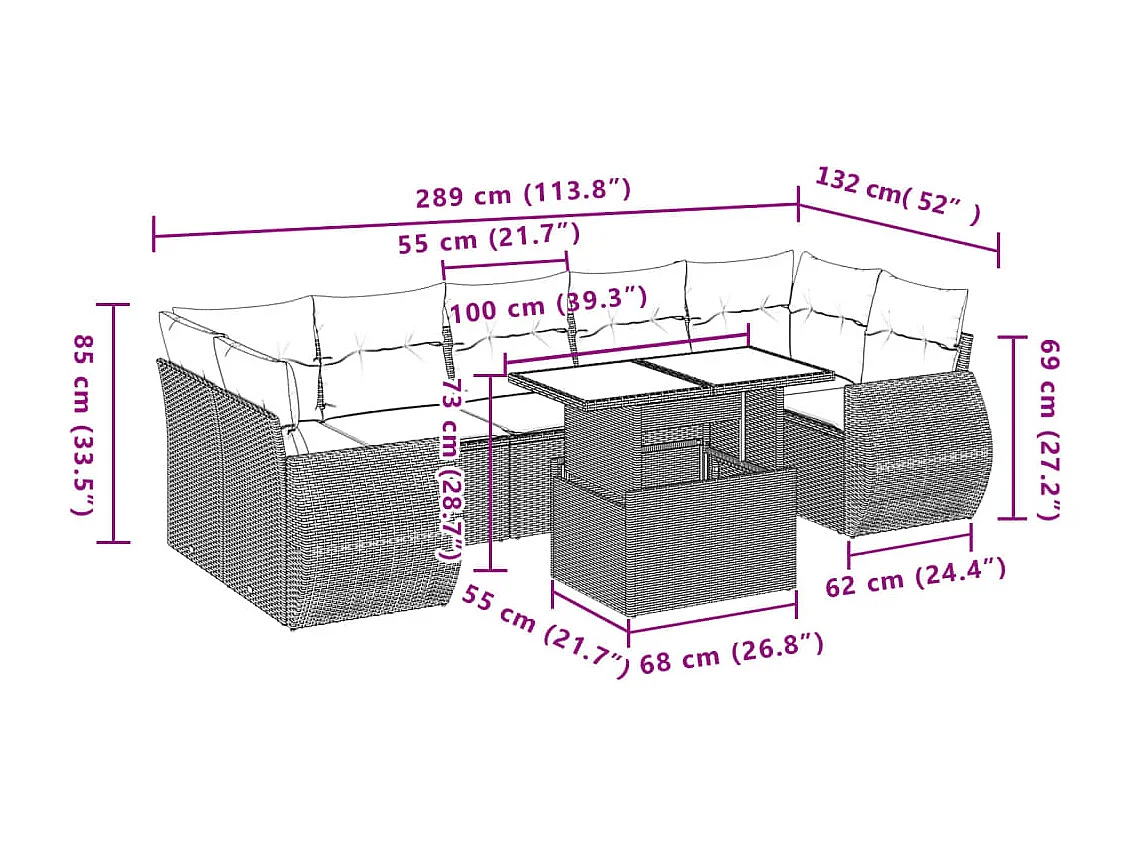 Conjunto de móveis de jardim com almofadas 9 peças resina de vime marrom