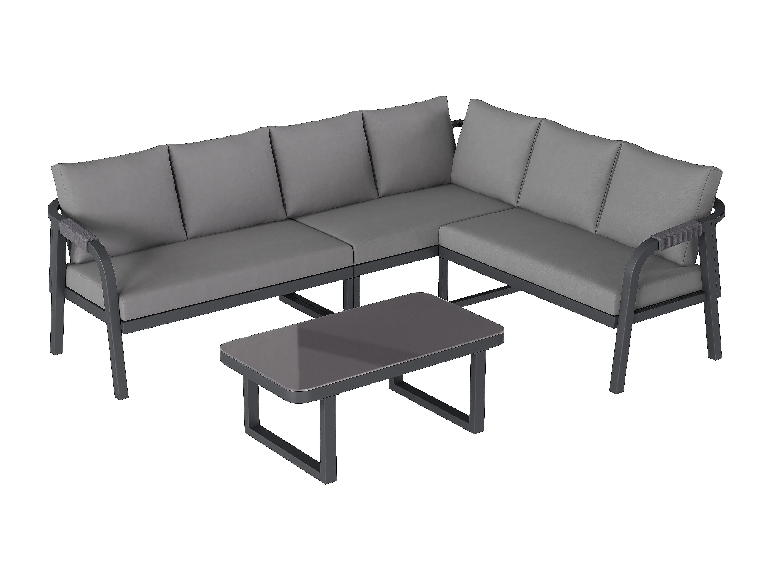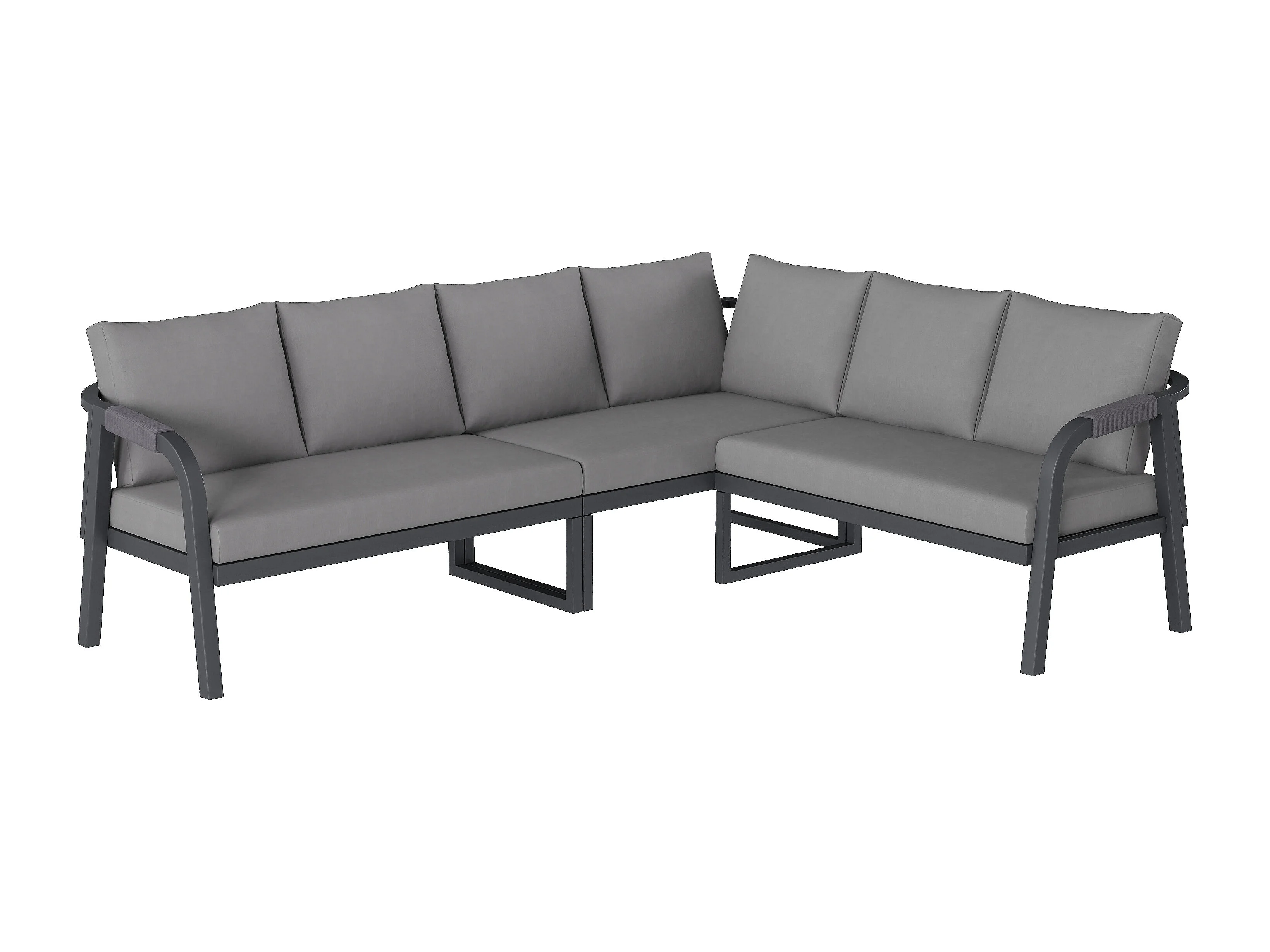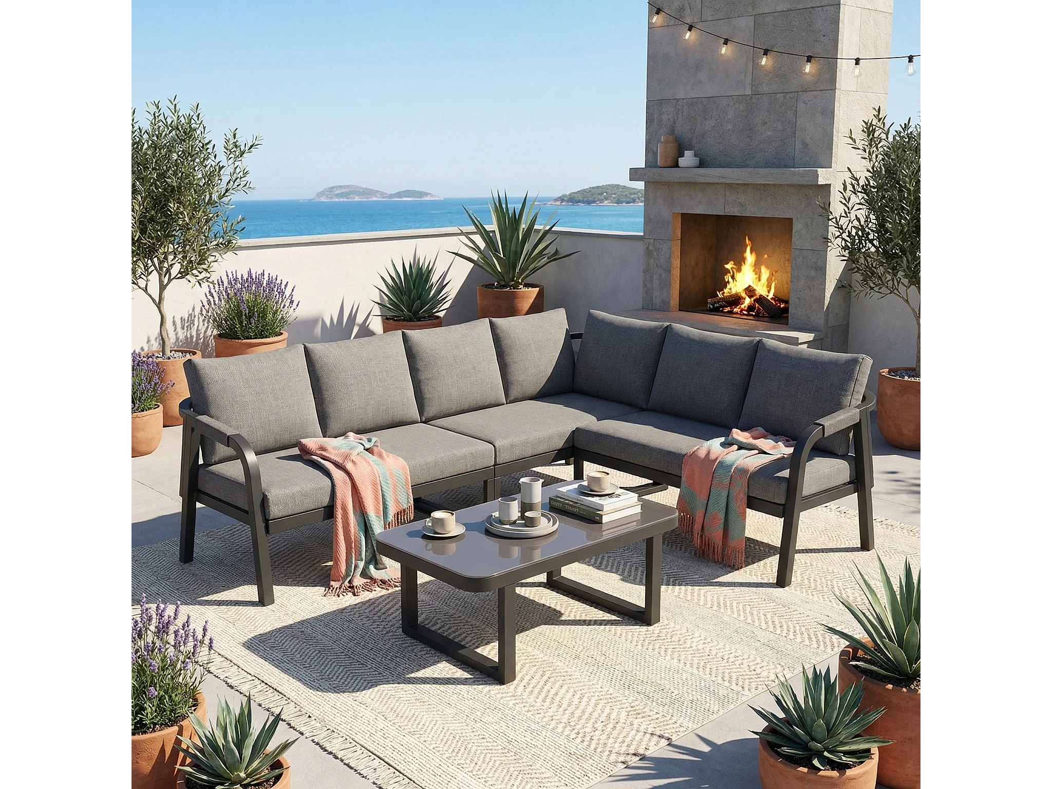 Conjunto de móveis de jardim para 6 pessoas - com apoios de braço e encostos trançados + sofá de canto + mesa - metal - cinza