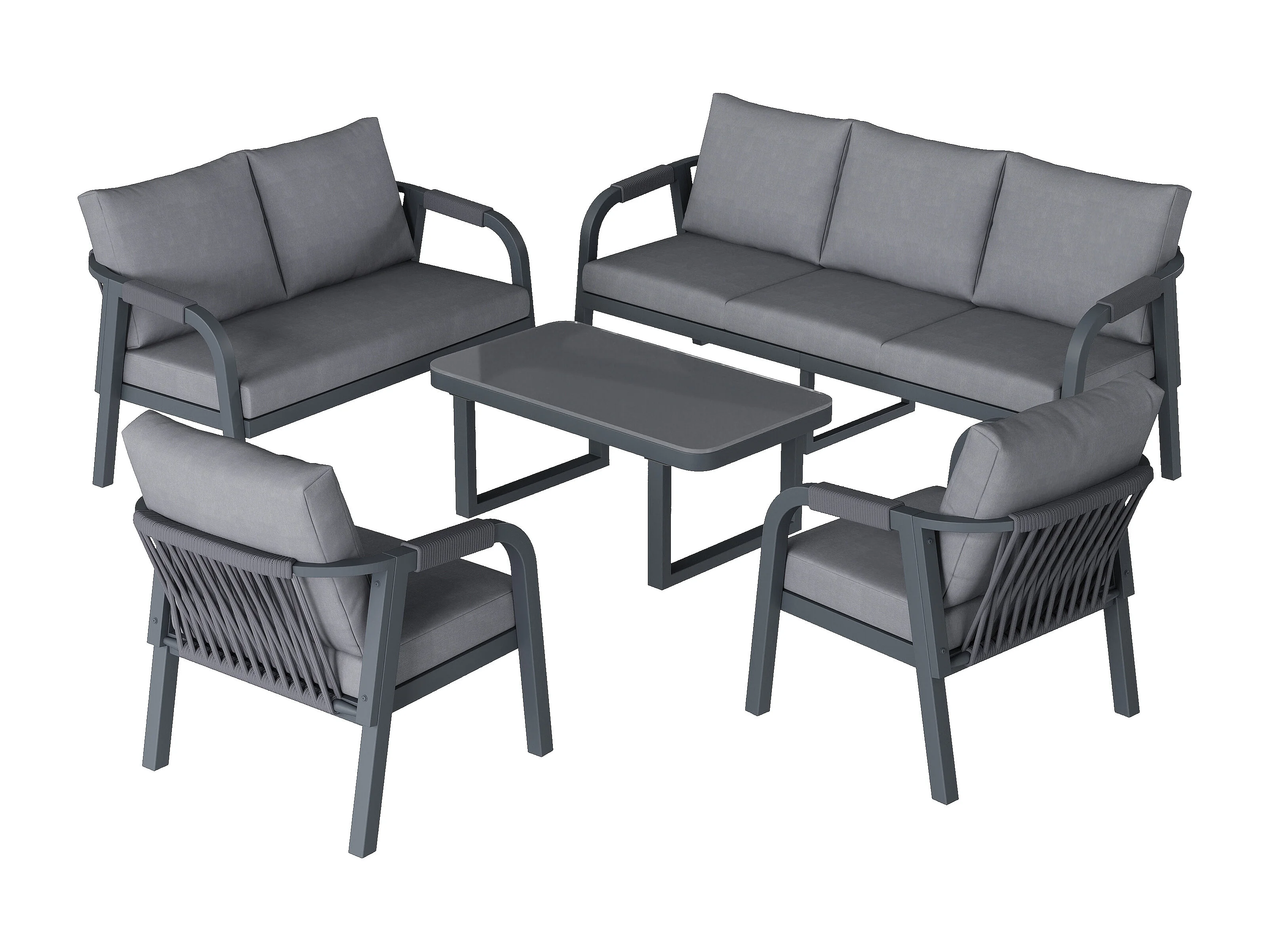 Conjunto de móveis de jardim para 7 pessoas - em corda trançada - com 2 sofás + mesa + 2 poltronas - metal - cinza