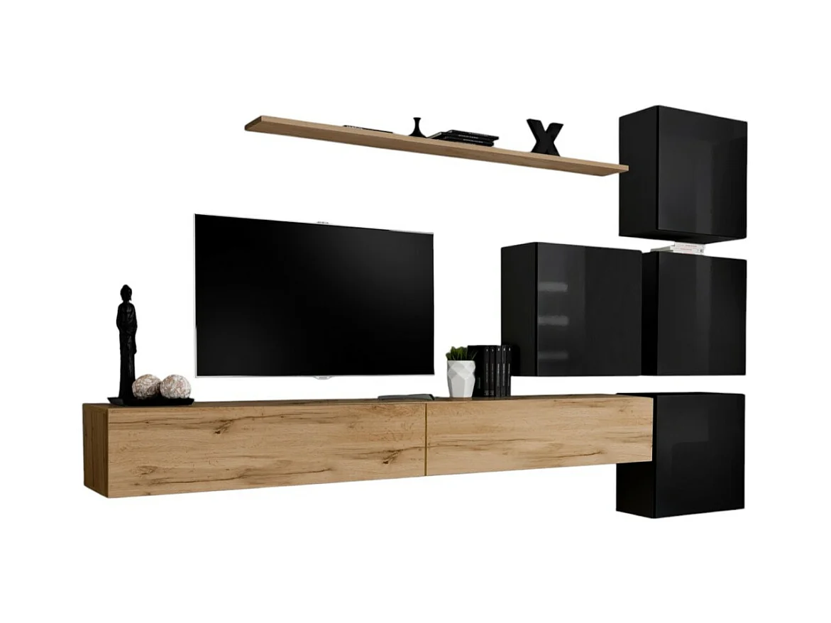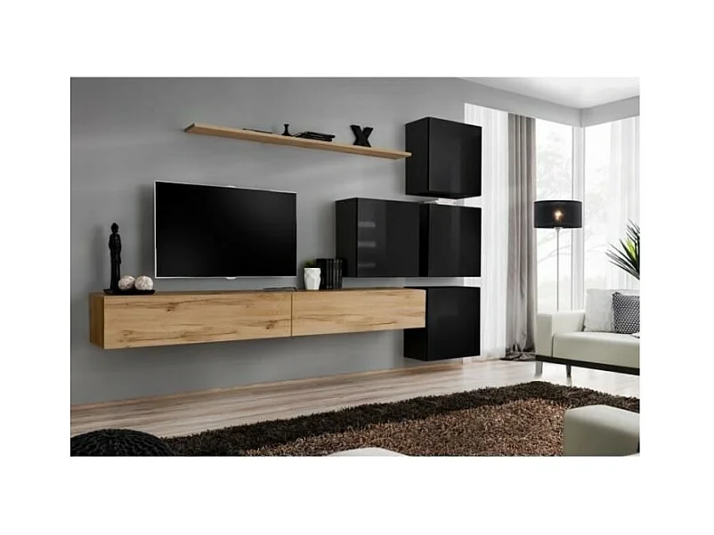 Conjunto de móveis de parede para sala de estar SWITCH IX design, cor carvalho Wotan e preto brilhante.