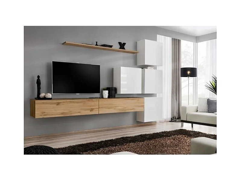 Conjunto de móveis suspensos para sua sala de estar da coleção SWITCH V. Cores carvalho Wotan e branco brilhante.