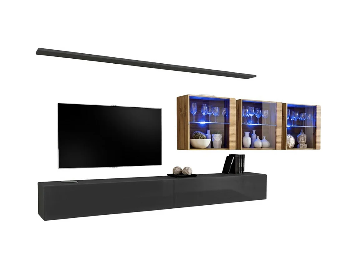 Conjunto de móveis de sala de estar mural SWITCH XIV design, cor cinza e preto brilhante.