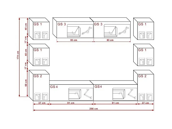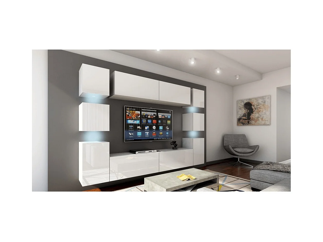 Conjunto de móveis de sala de estar brancos suspensos coleção CEPTO XXIV. 256cm, 8 móveis, com LEDs, modulares.