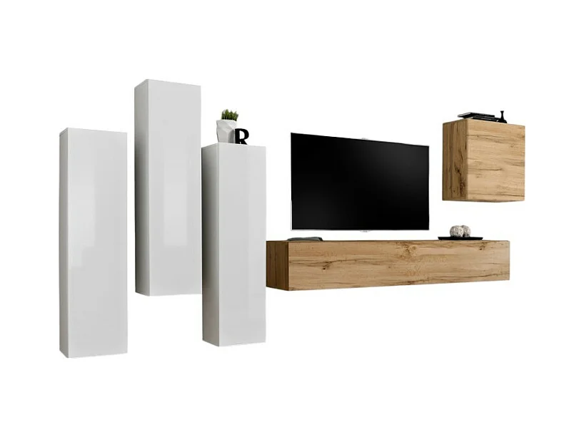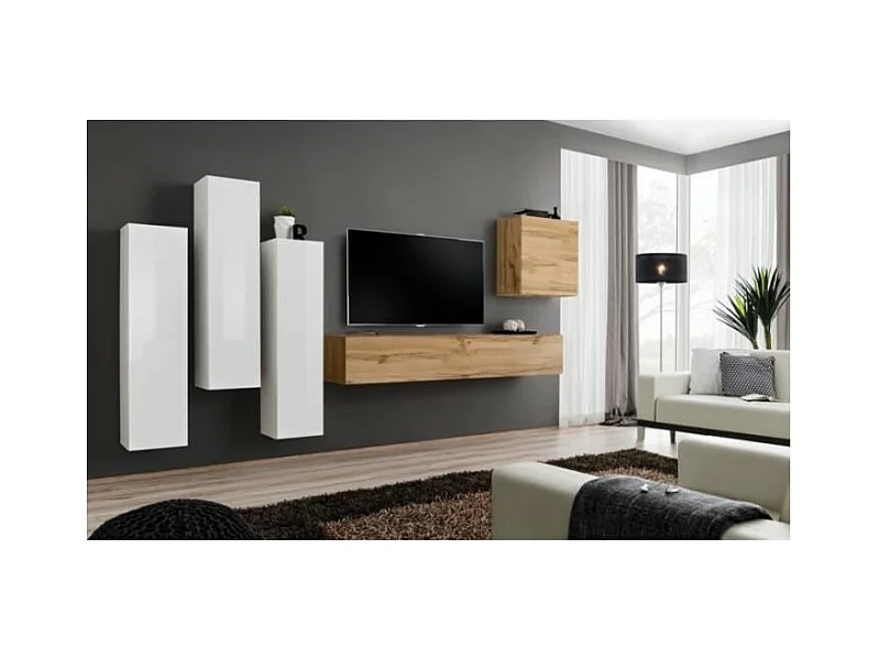 Conjunto de móveis de sala de estar design coleção SWITCH III. Cor branca brilhante e carvalho Wotan.