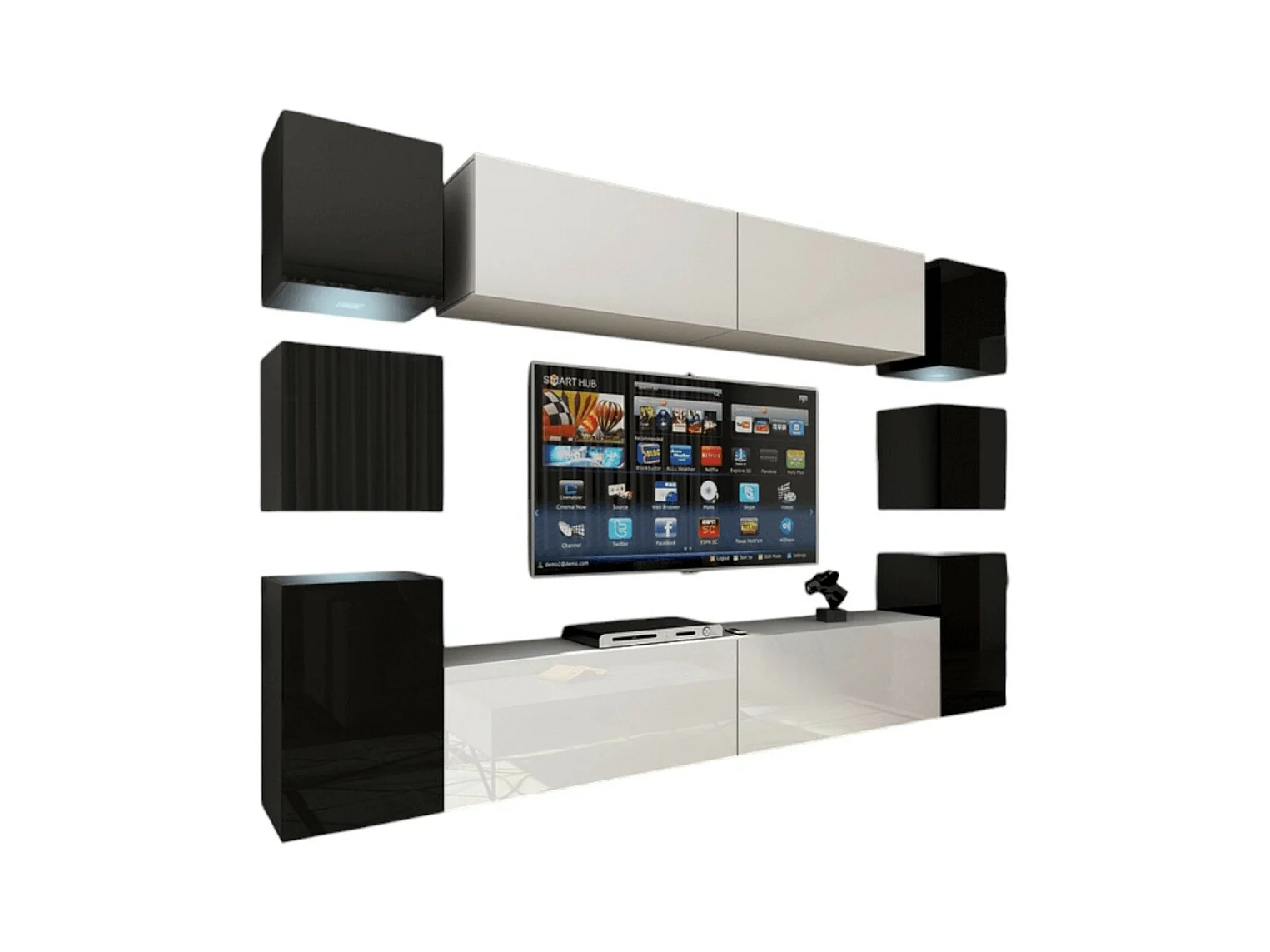 Conjunto de móveis para sala de estar preto e branco suspensos coleção CEPTO XVII 249cm, 10 móveis, com LEDs, modulares.