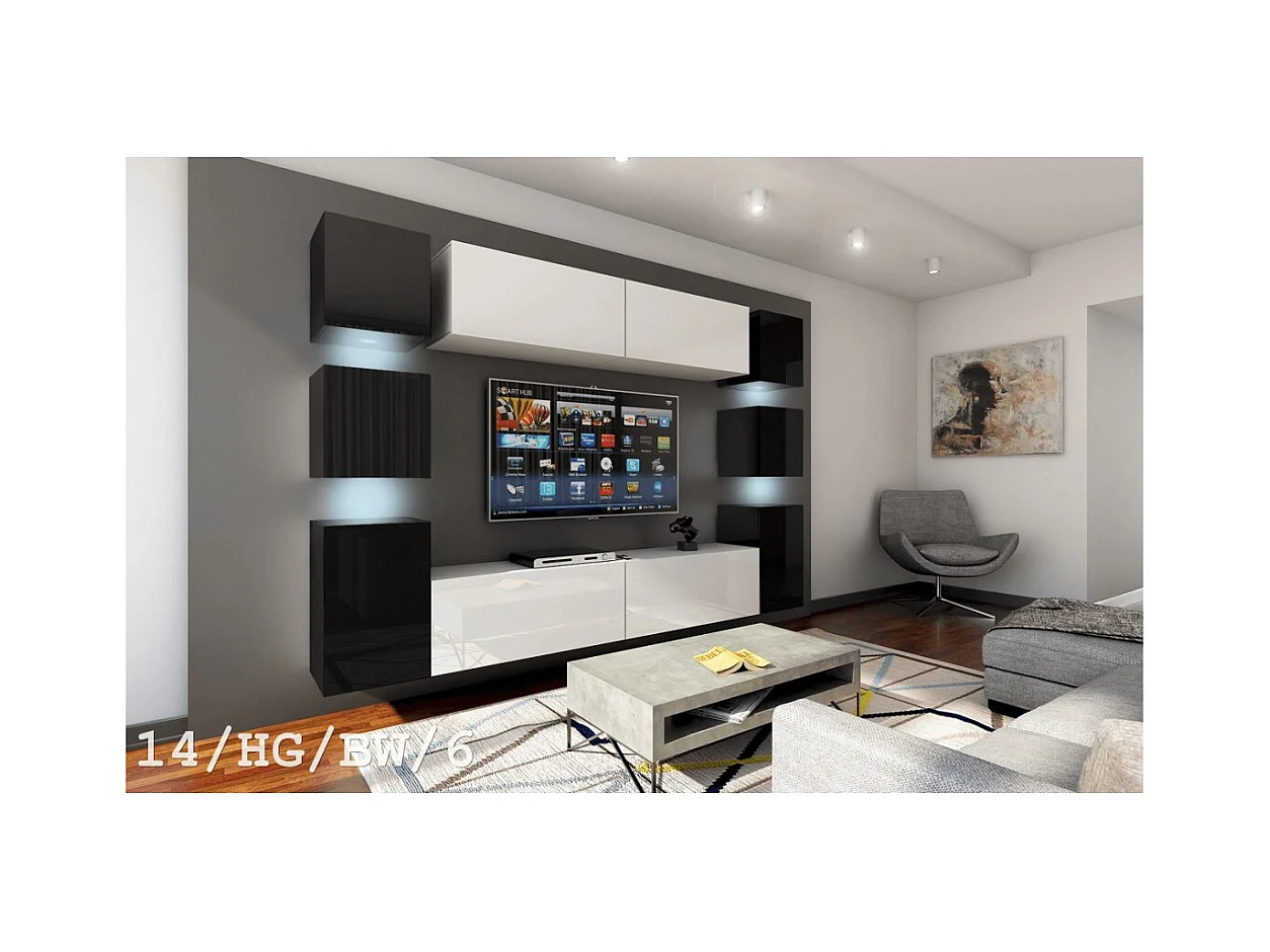 Conjunto de móveis de sala de estar preto e branco suspensos coleção CEPTO XIV. 256cm, 10 móveis, 10 portas, leds.