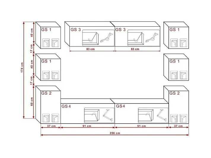 Conjunto de móveis de sala de estar pretos suspensos coleção CEPTO XXIV. 256cm, 8 móveis, LEDs, modulares.