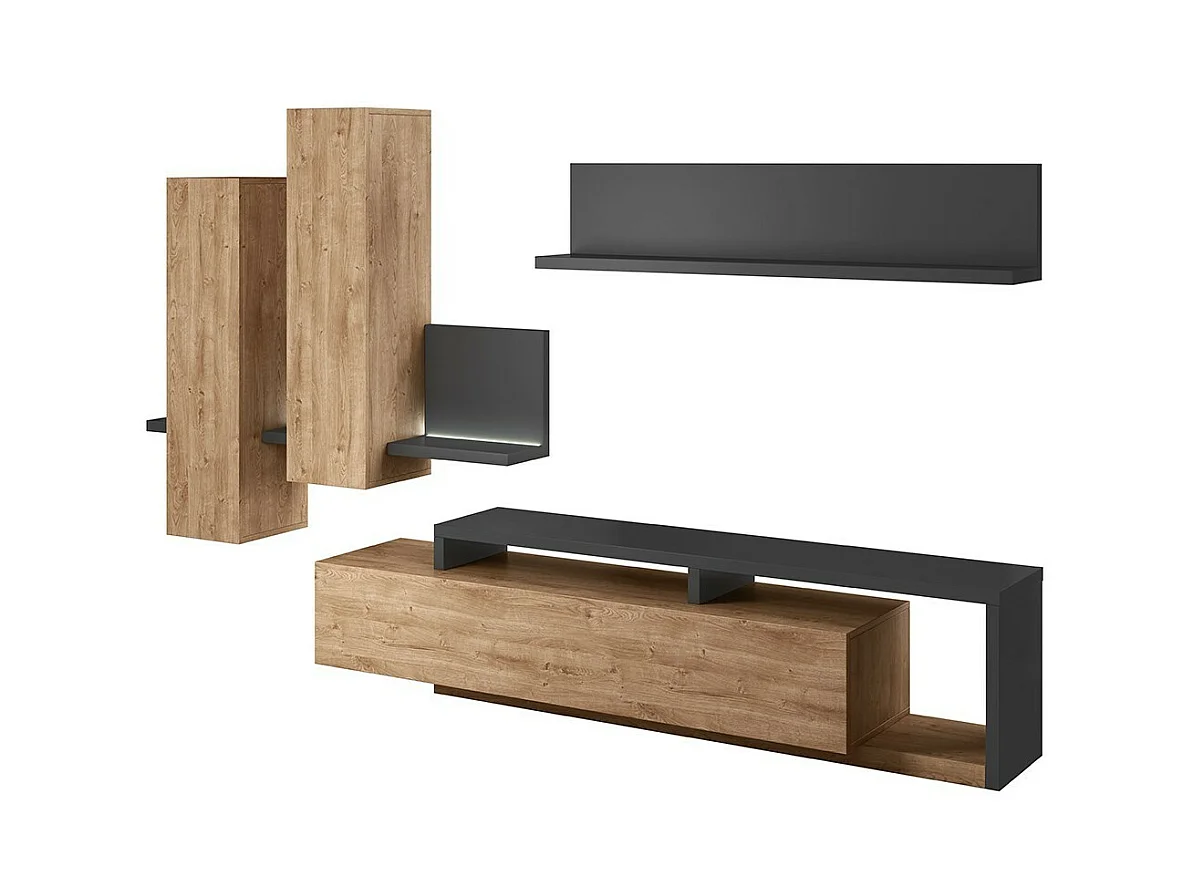 Conjunto de móveis para sala de estar com LED, coleção BERGAMO. Cores carvalho e cinza.