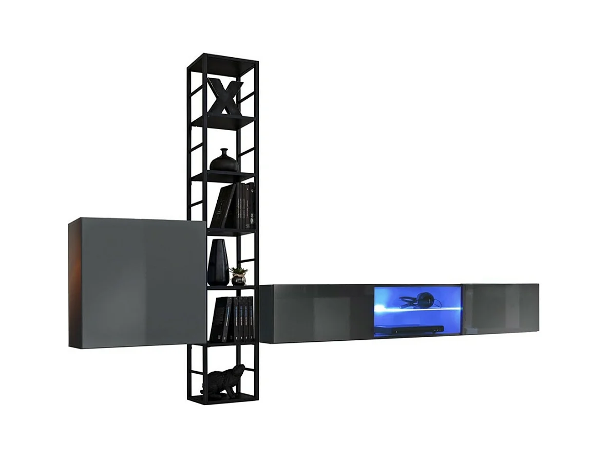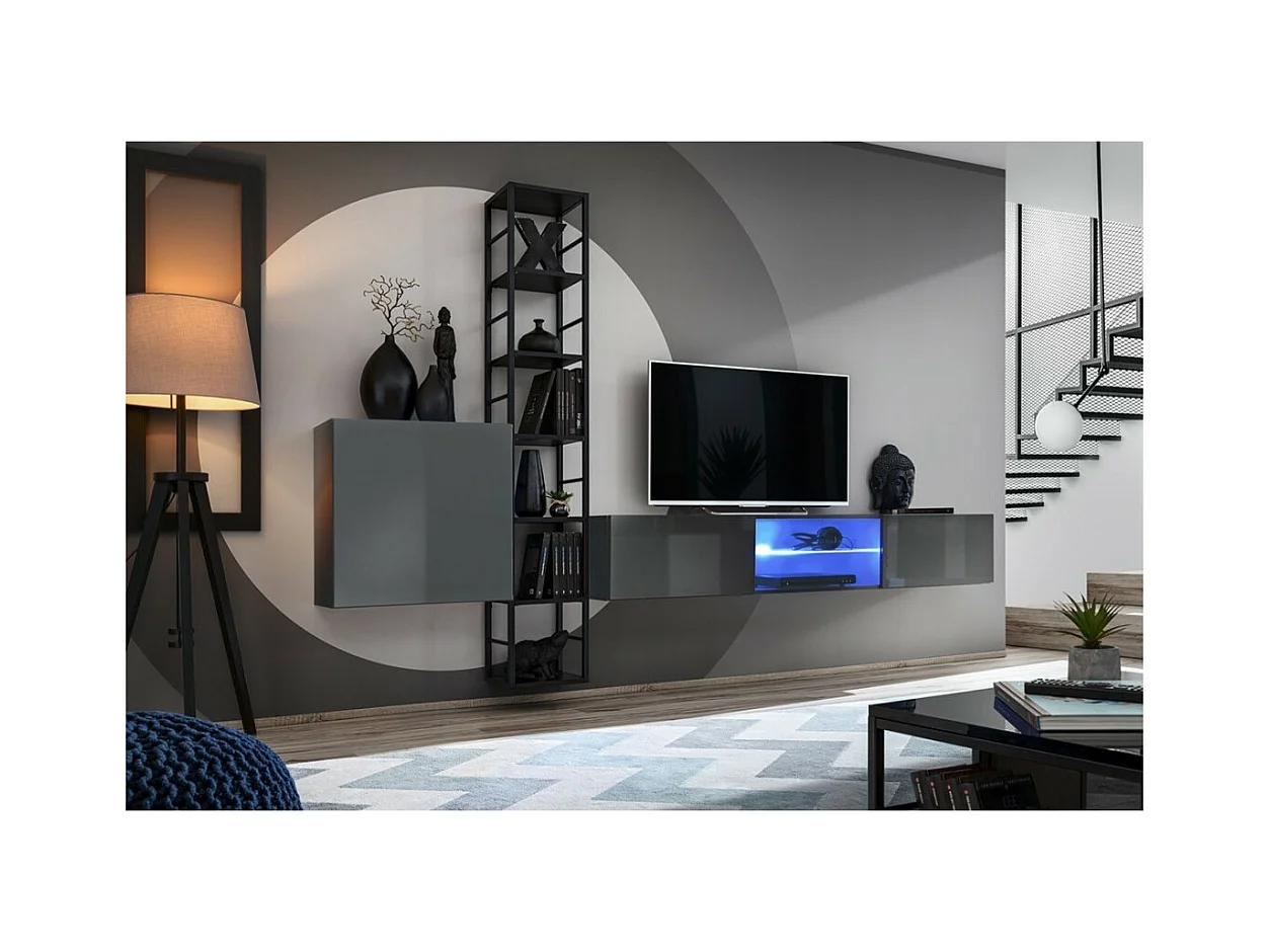 Conjunto de móveis de parede para sala de estar SWITCH XVII design, nas cores cinza e preto brilhante.