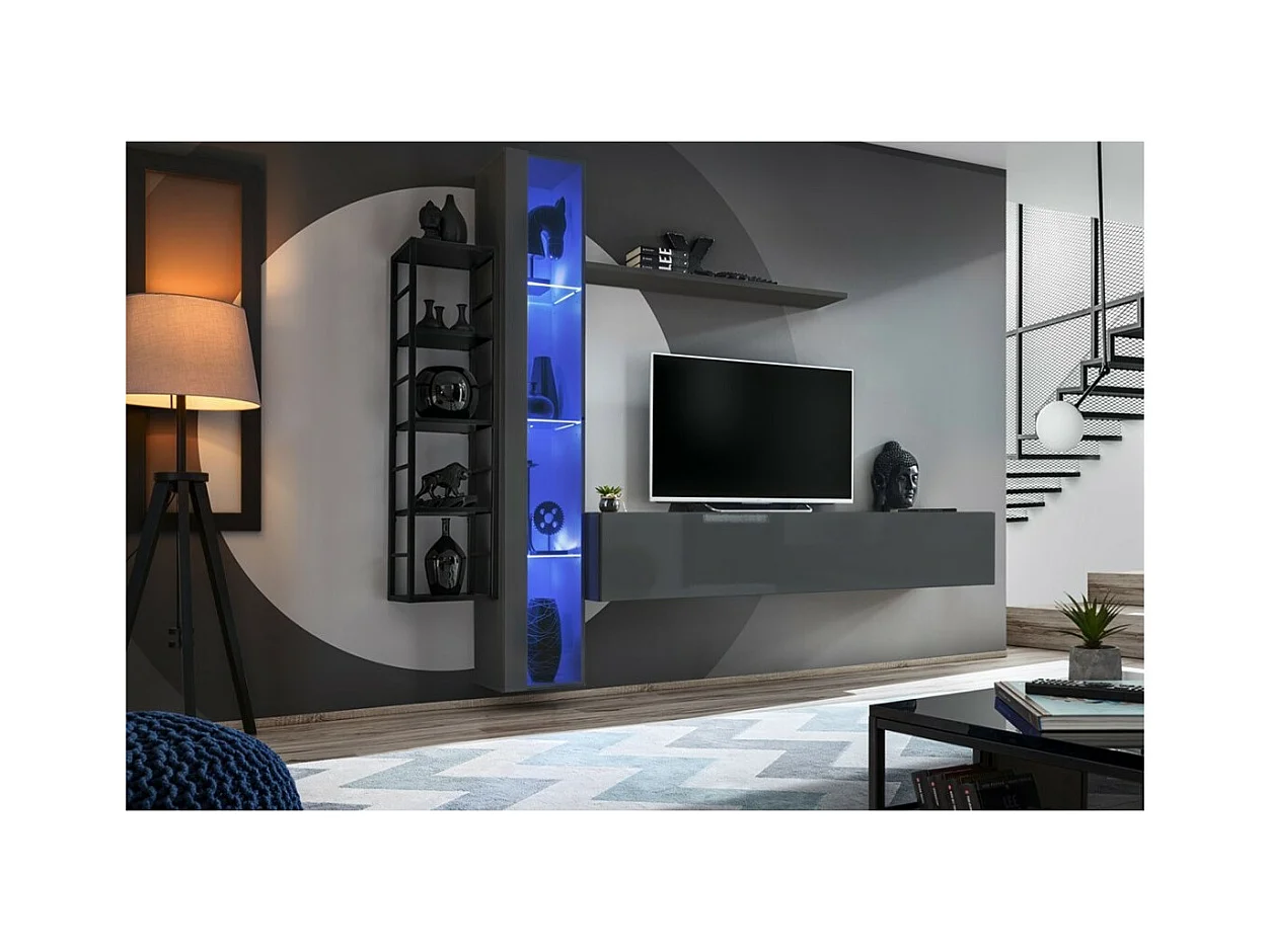 Conjunto de móveis de parede para sala de estar SWITCH XVI, design moderno, nas cores cinza e preto brilhante.