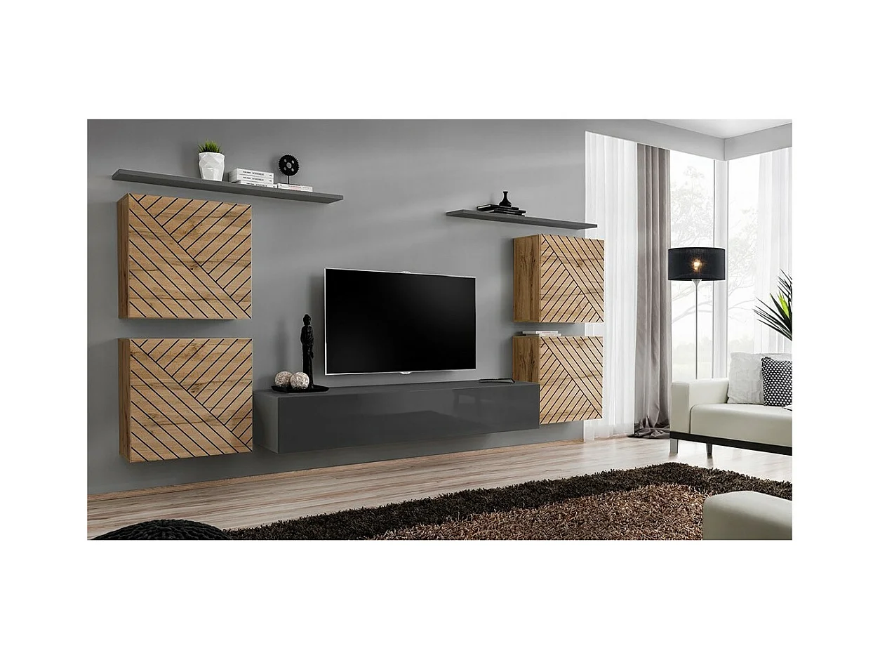 Conjunto de móveis para sala de estar SWITCH IV. Cores em carvalho e cinza. Acabamentos em carvalho fresado e cinza brilhante.