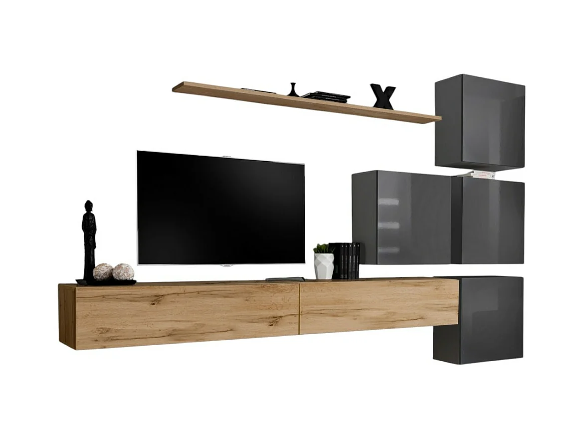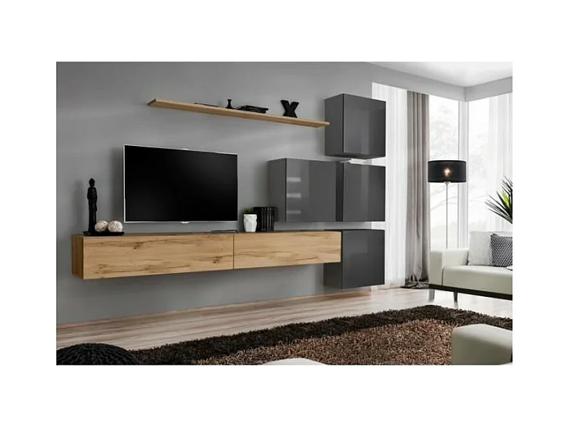 Conjunto de móveis para sala SWITCH I design, cor cinza brilhante e carvalho Wotan.
