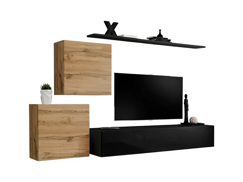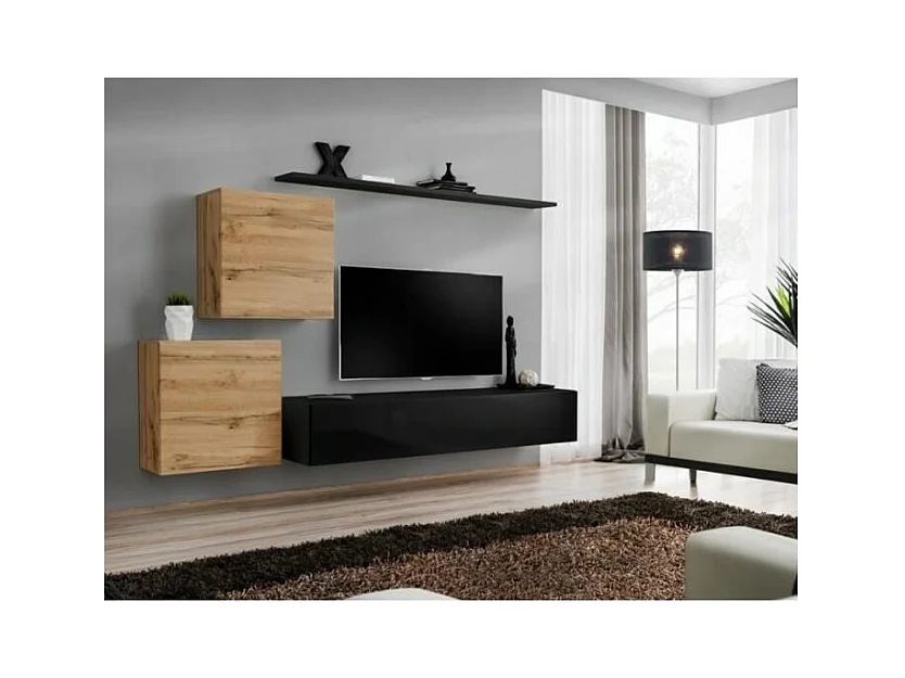 Conjunto de móveis para sala de estar SWITCH V design, cor preto brilhante e carvalho Wotan.