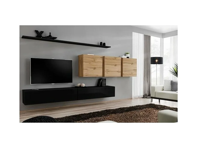 Conjunto de móveis para sala de estar SWITCH V design, cor preto brilhante e carvalho Wotan.