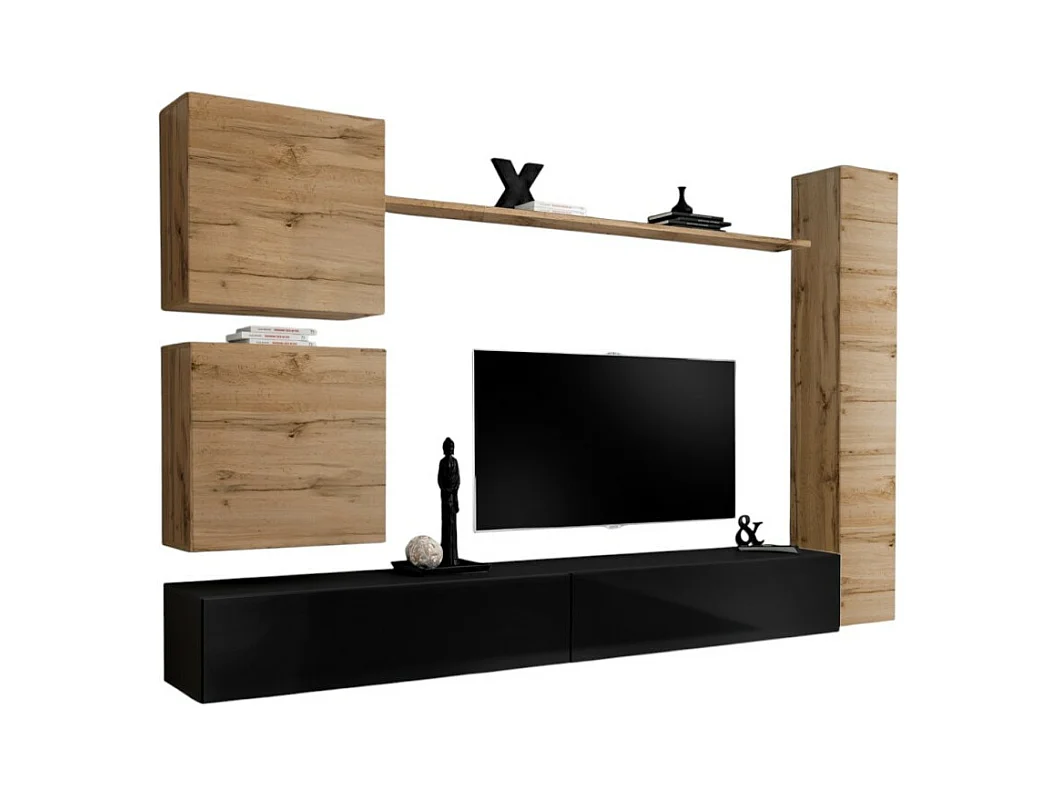 Conjunto de móveis para sala de estar SWITCH VI. Cores preto e carvalho com acabamento preto brilhante e efeito de carvalho fresado.