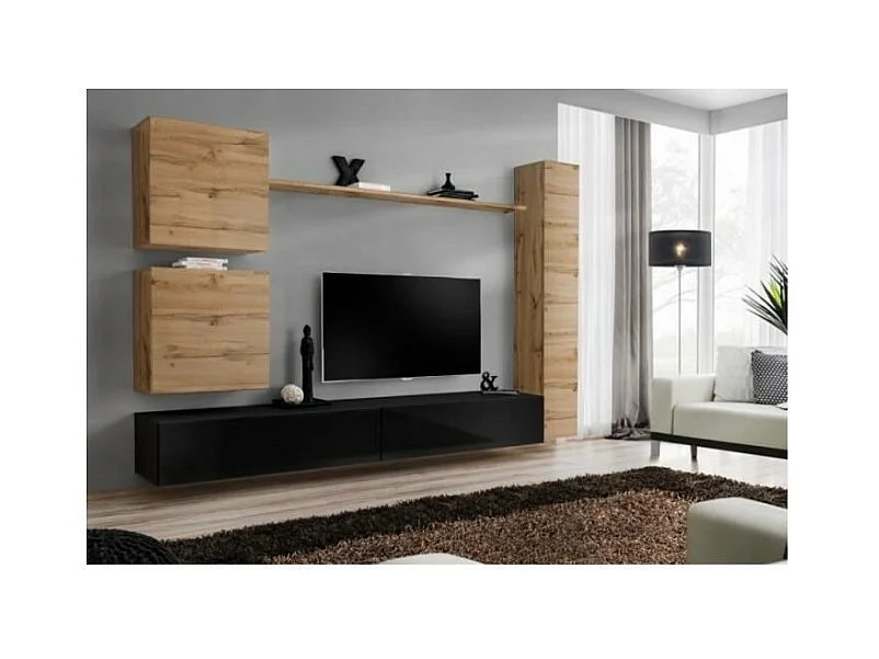 Conjunto de móveis para sala de estar SWITCH VIII. Móvel de TV de parede design, cor preto brilhante e carvalho Wotan.