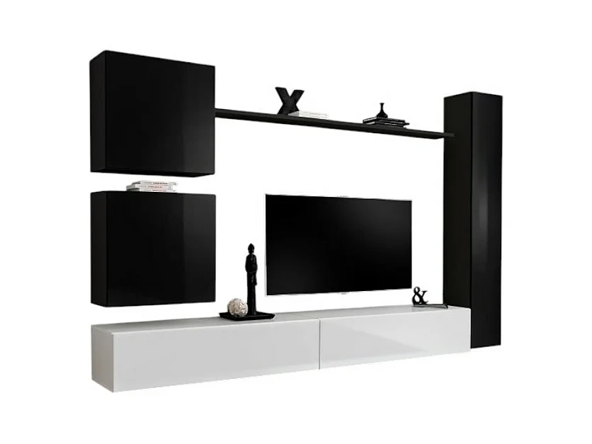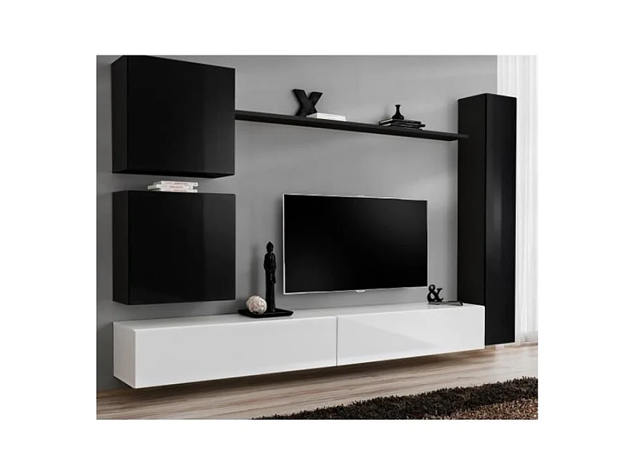 Conjunto de móveis para sala de estar SWITCH VIII. Móvel de TV de parede design, nas cores branco e preto brilhante.