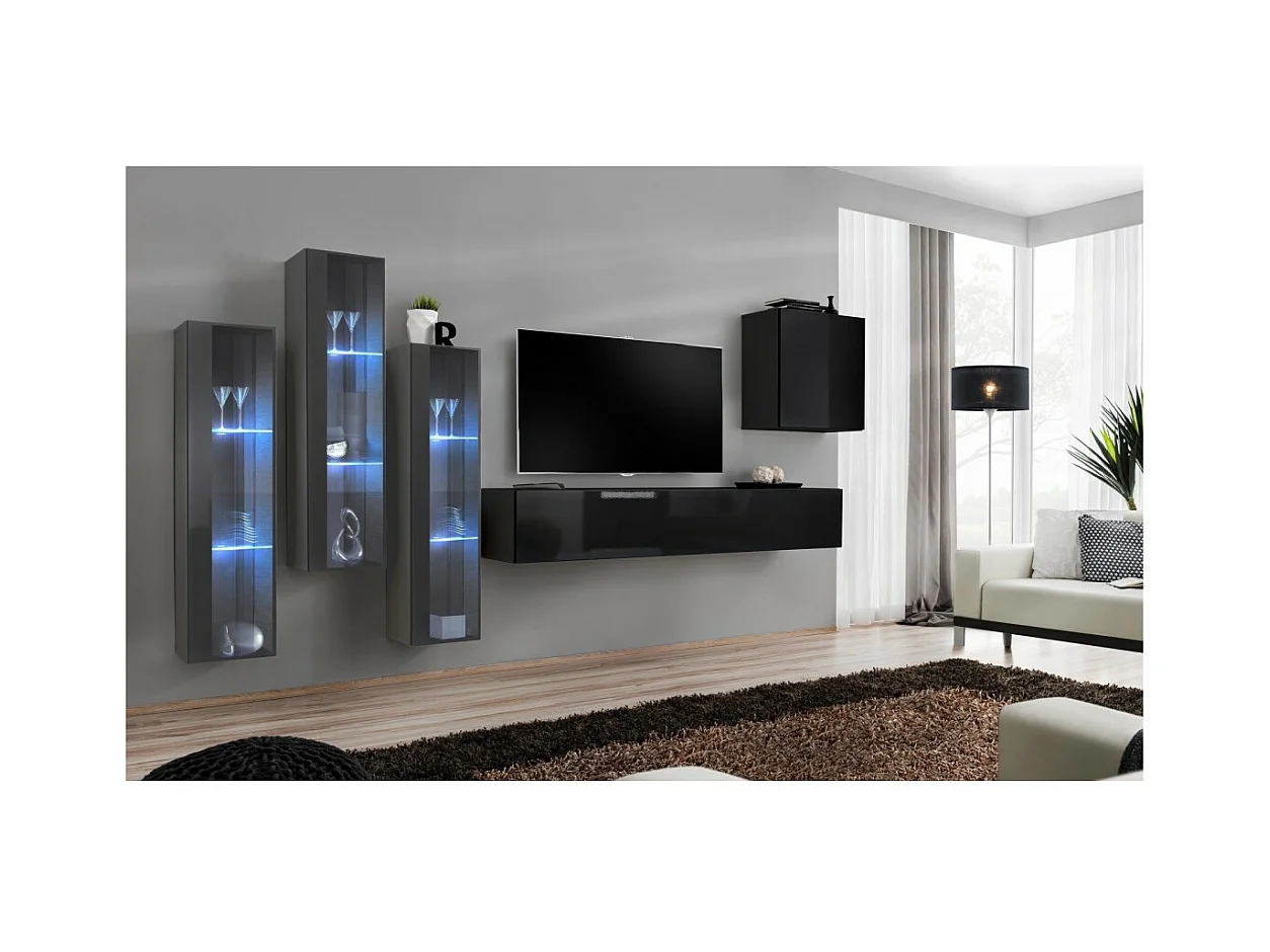 Conjunto de móveis para sala de estar SWITCH XIII, design de parede, nas cores preto brilhante e cinza.
