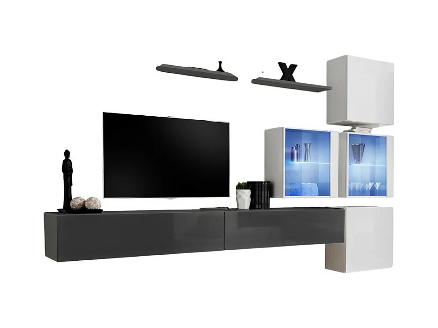 Conjunto de móveis de parede para sala de estar SWITCH XVII, design em cores cinza e branco brilhante.