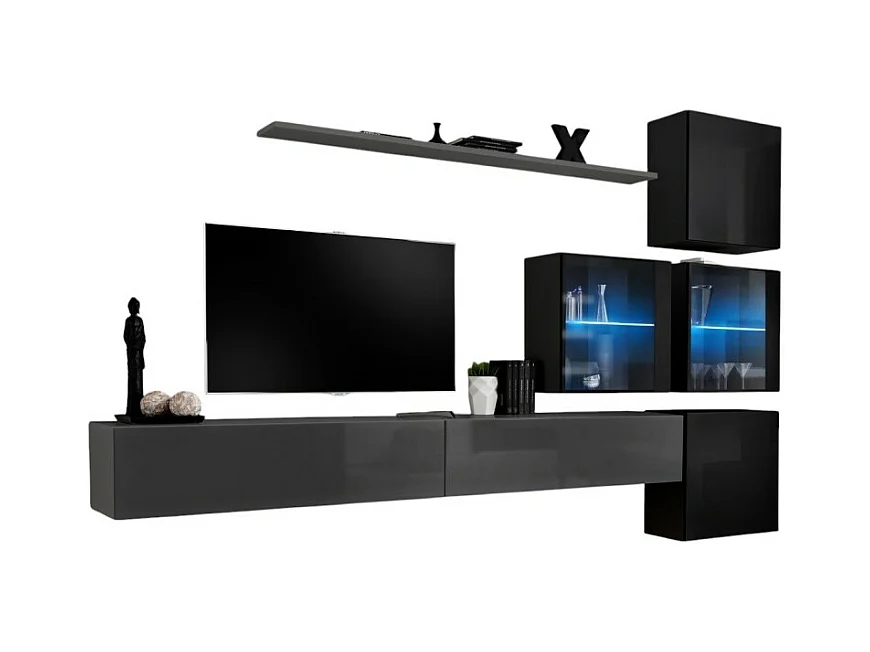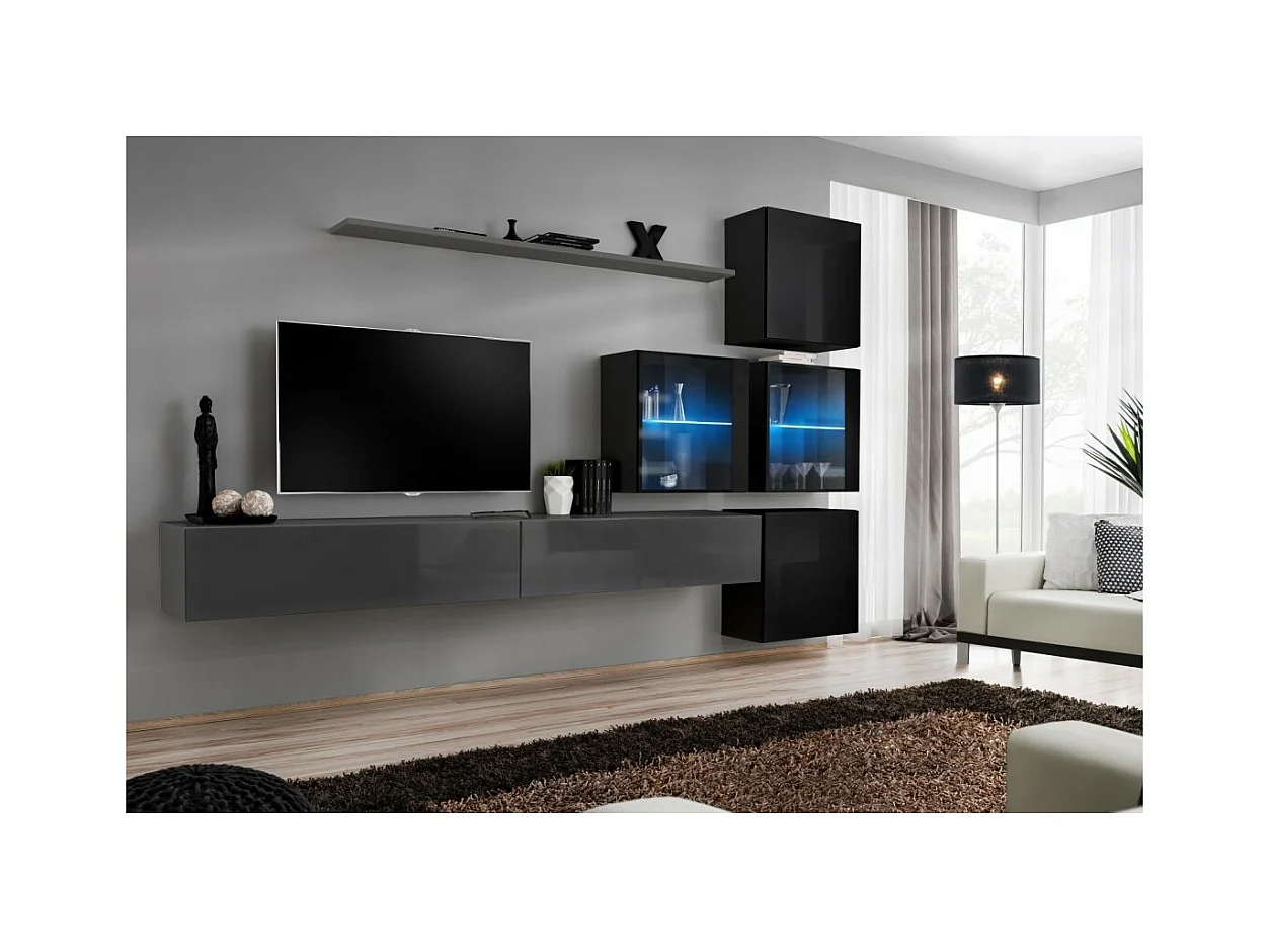 Conjunto de móveis de parede para sala de estar SWITCH XVII design, nas cores cinza e preto brilhante.