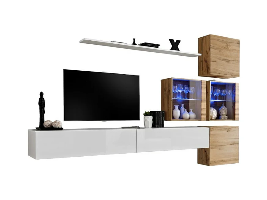 Conjunto de móveis para sala de estar SWITCH XIX design, na cor branco brilhante e carvalho Wotan.