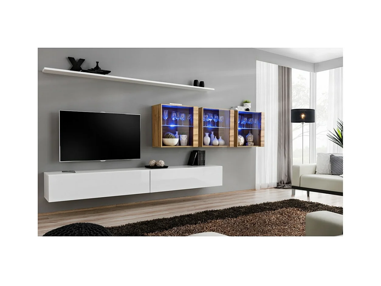 Conjunto de móveis de sala de estar mural SWITCH XIV design, na cor branco brilhante e carvalho Wotan.