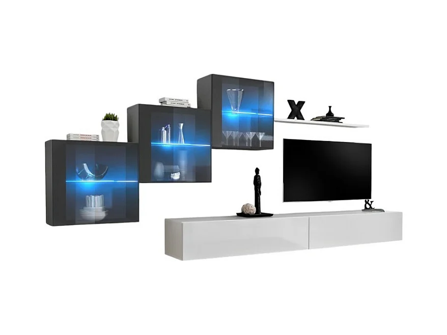 Conjunto de móveis para sala de estar SWITCH XIII, design mural, nas cores branco brilhante e preto.