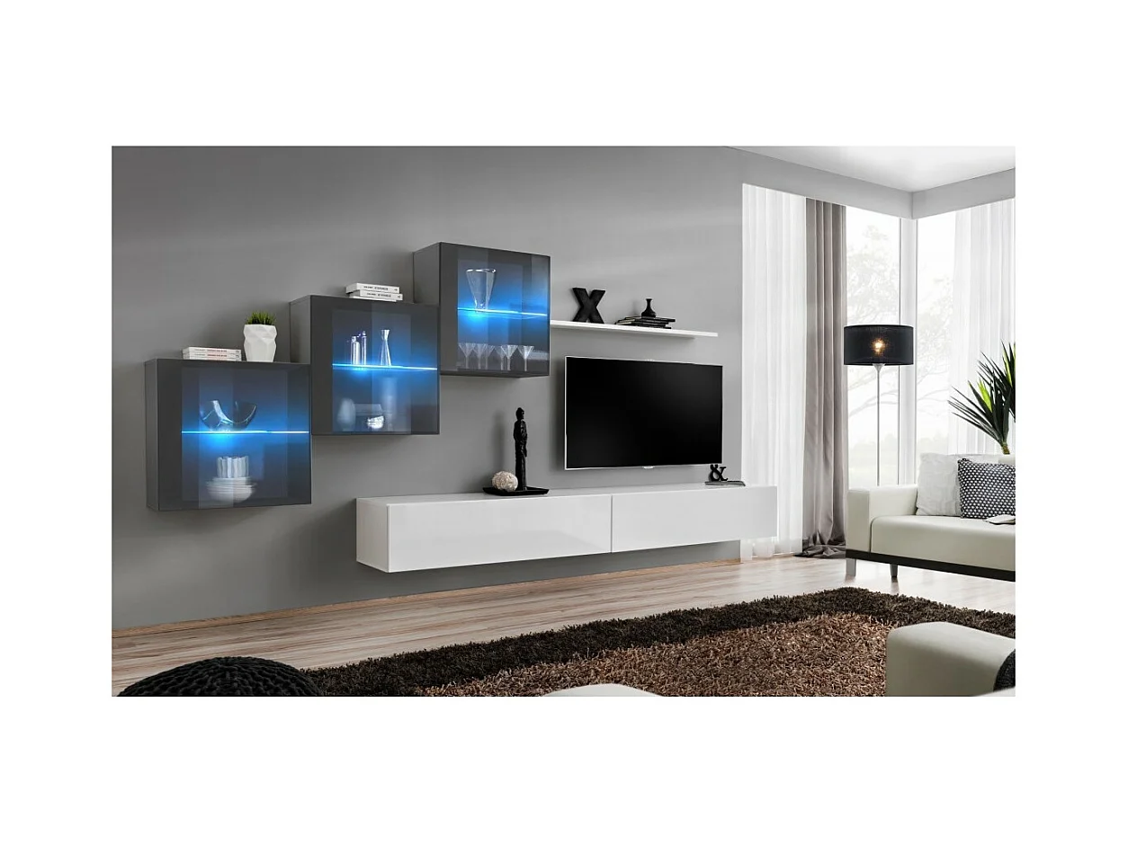 Conjunto de móveis de parede para sala de estar SWITCH XIII, design, nas cores branco brilhante e cinza.