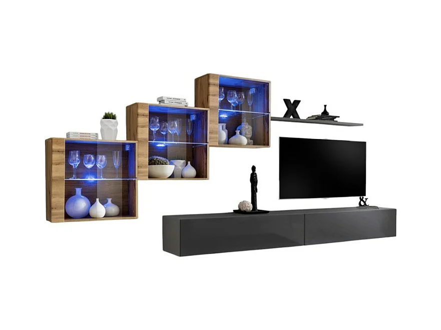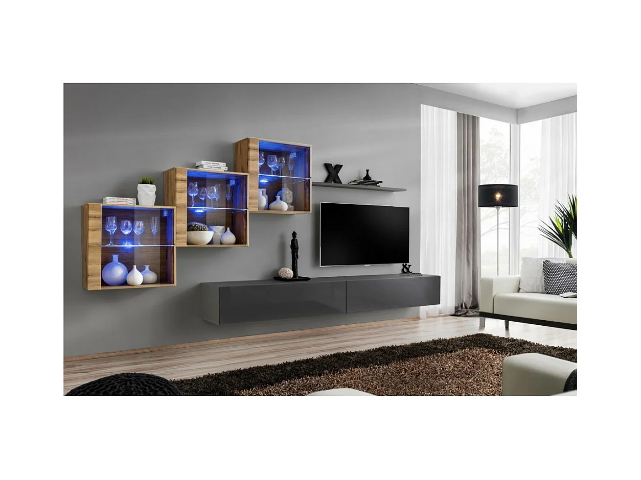 Conjunto de móveis de parede para sala de estar SWITCH XI design, cor cinza brilhante e carvalho Wotan.