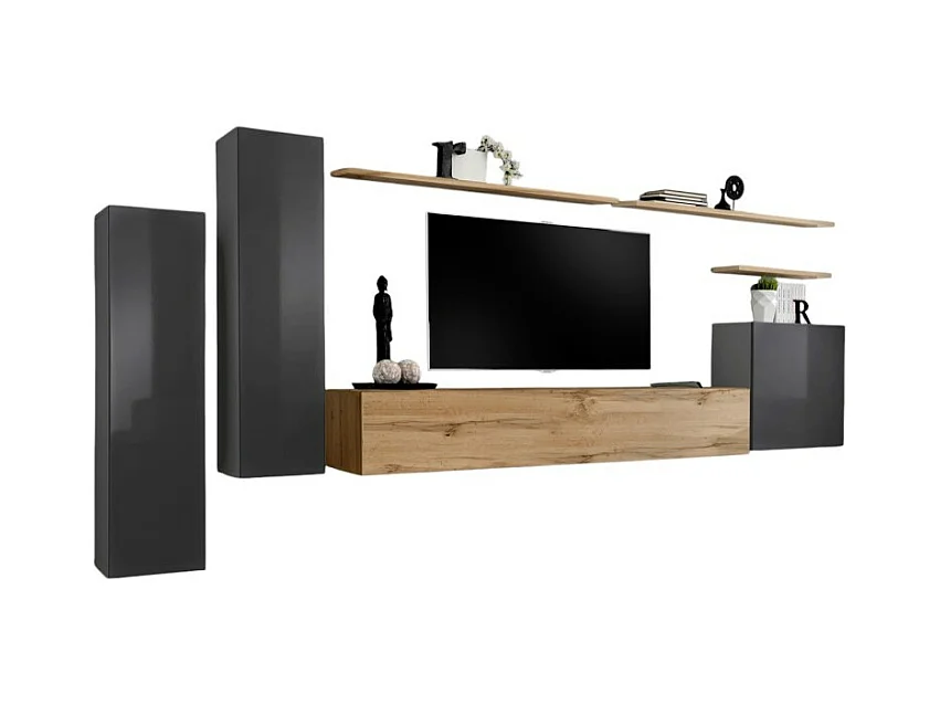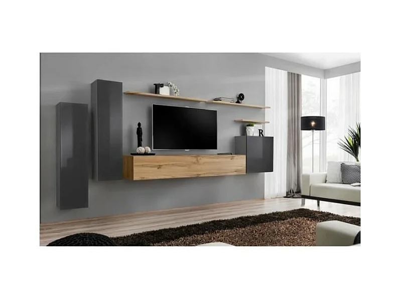 Conjunto de móveis para sala SWITCH I design, cor cinza brilhante e carvalho Wotan.