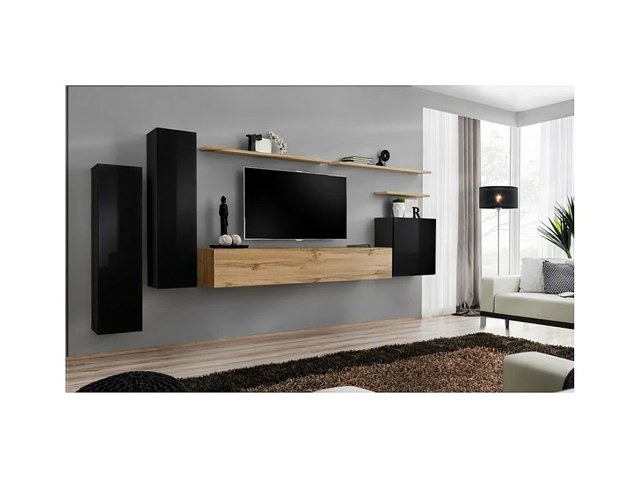 Conjunto de móveis para sala SWITCH I design, cor preto brilhante e carvalho Wotan.