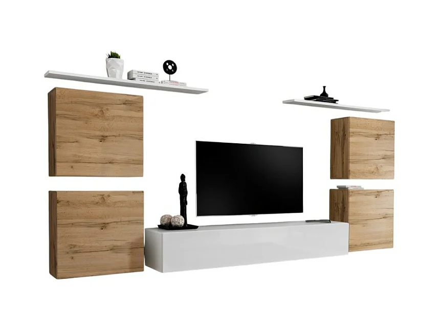 Conjunto de móveis para sala SWITCH V design, cor branco brilhante e carvalho Wotan.