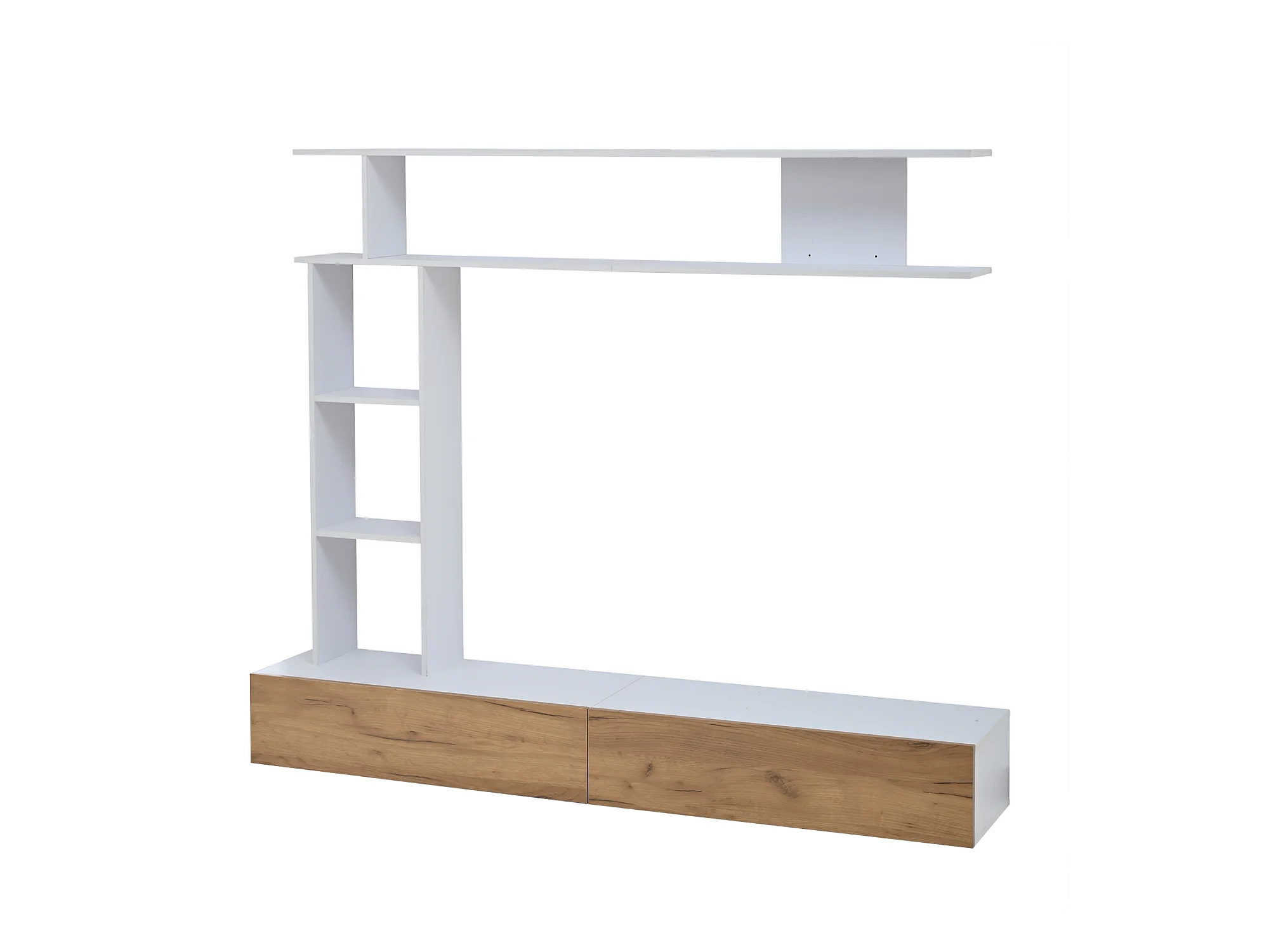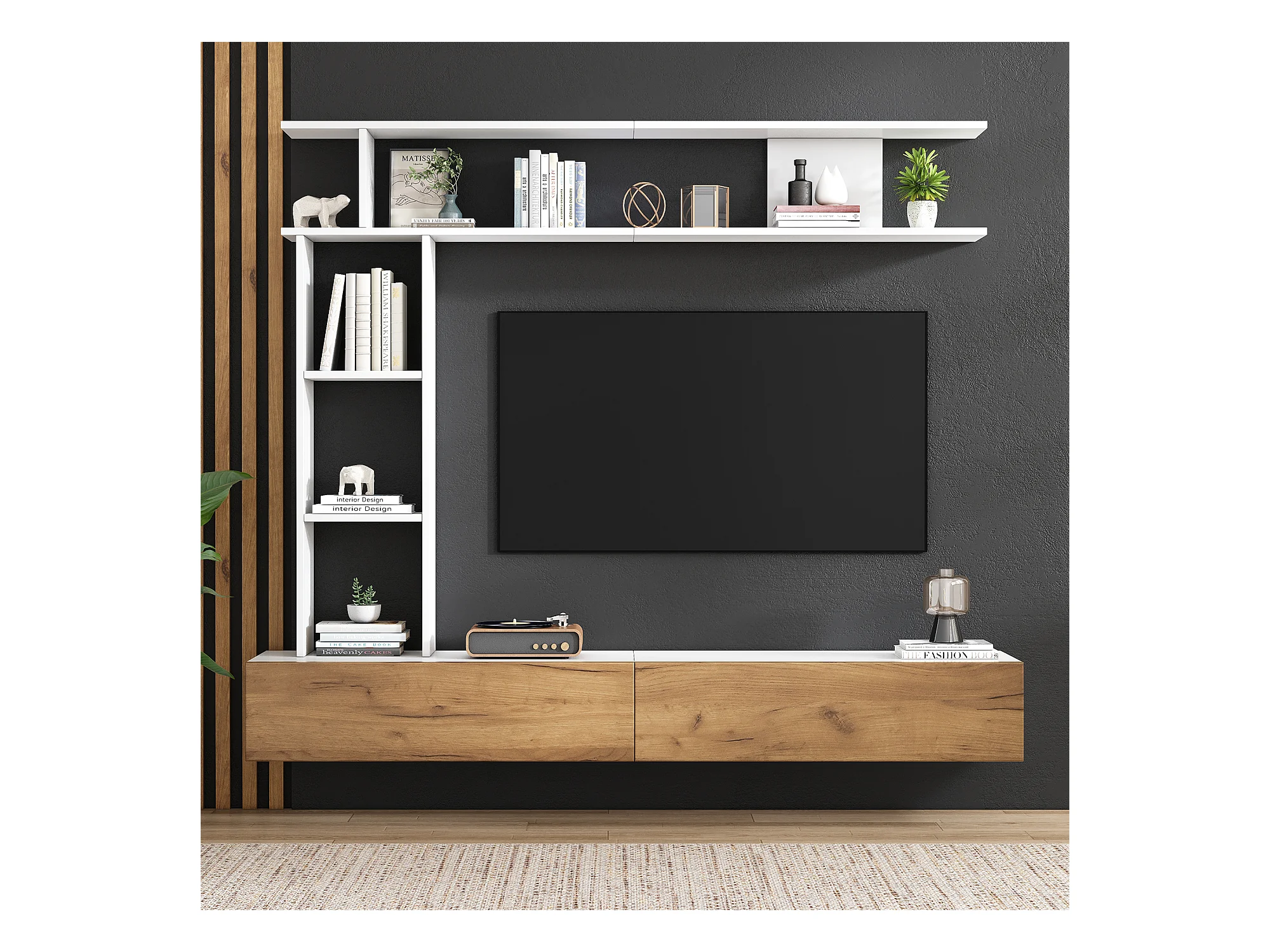 Conjunto de suportes para TV e 2 armários Akram em branco e madeira