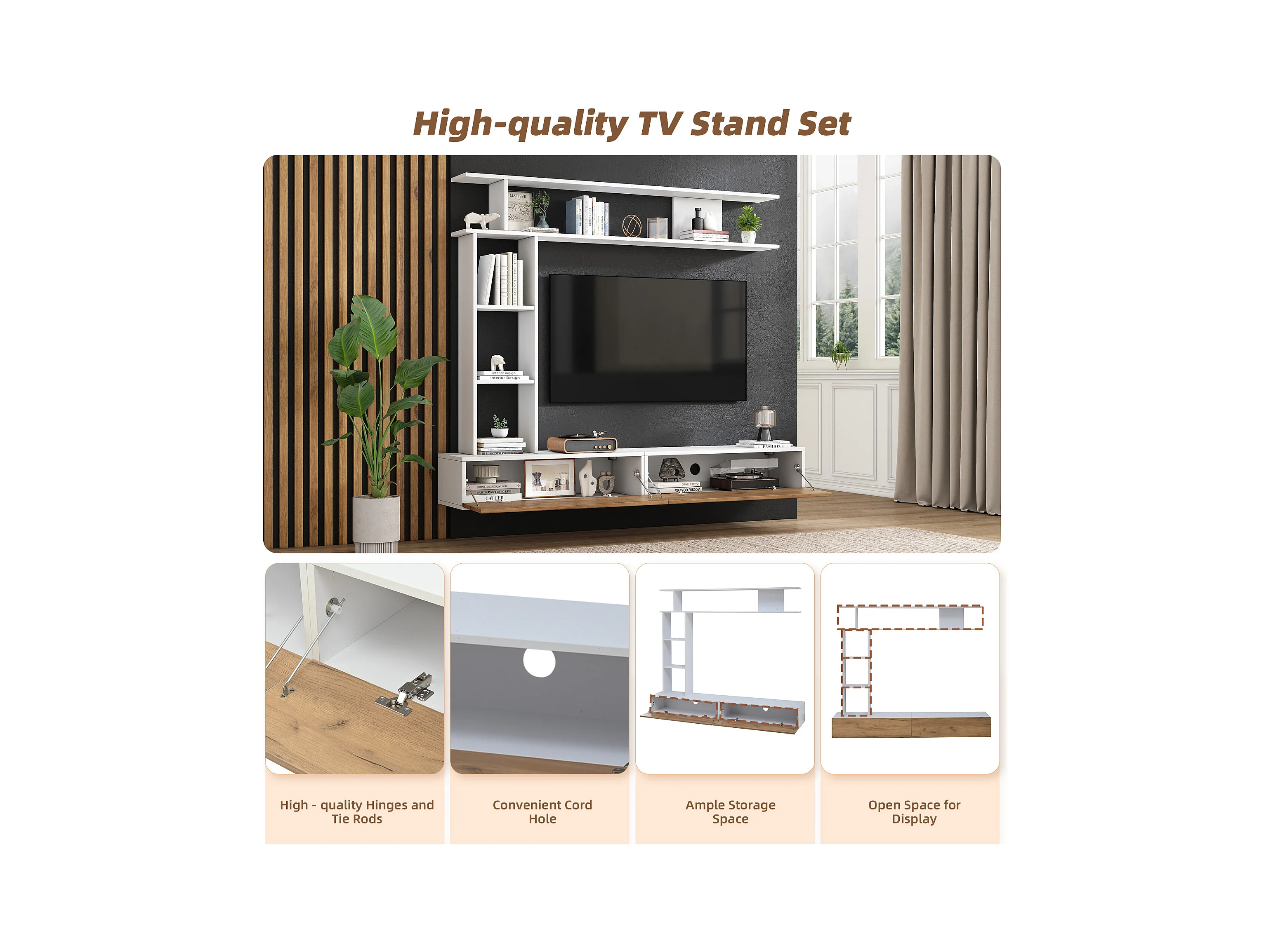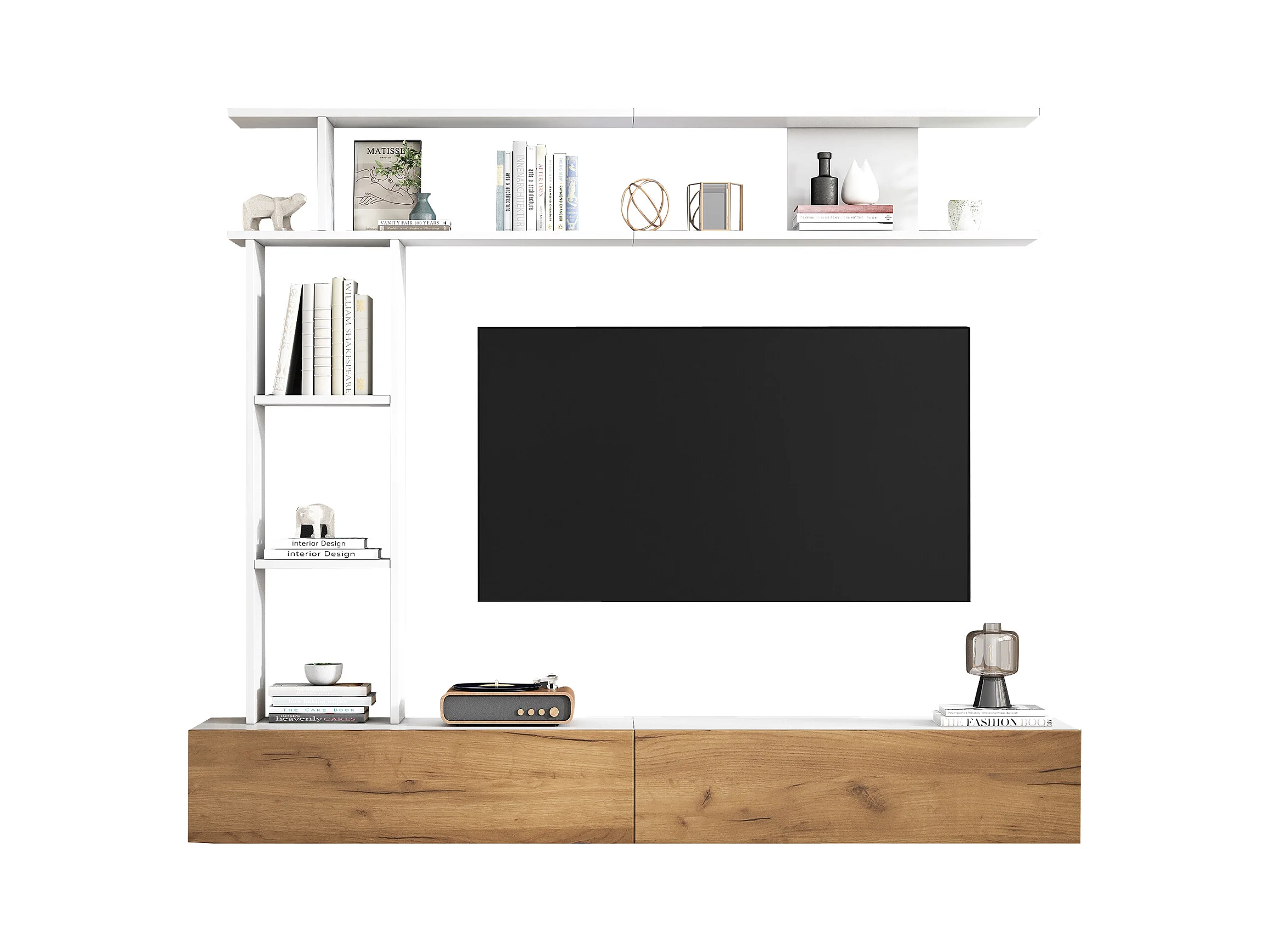 Conjunto de móvel para TV 3 peças – móvel para TV + prateleira vertical + prateleira de parede – 2 portas basculantes - branco e natural