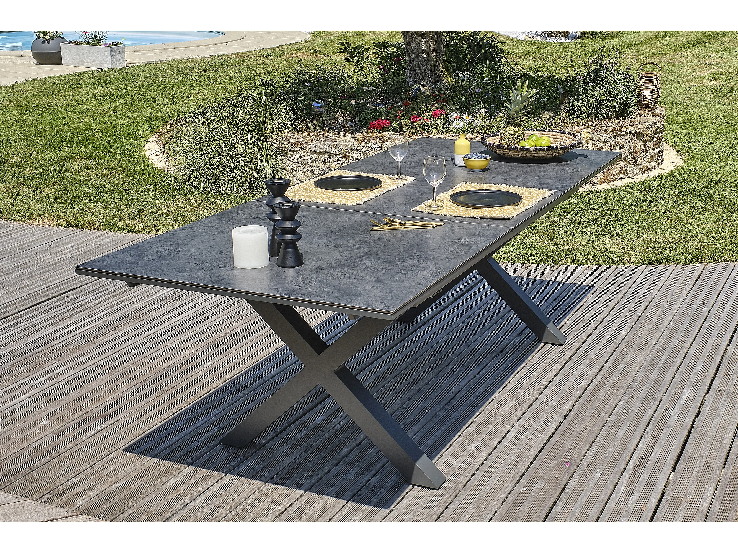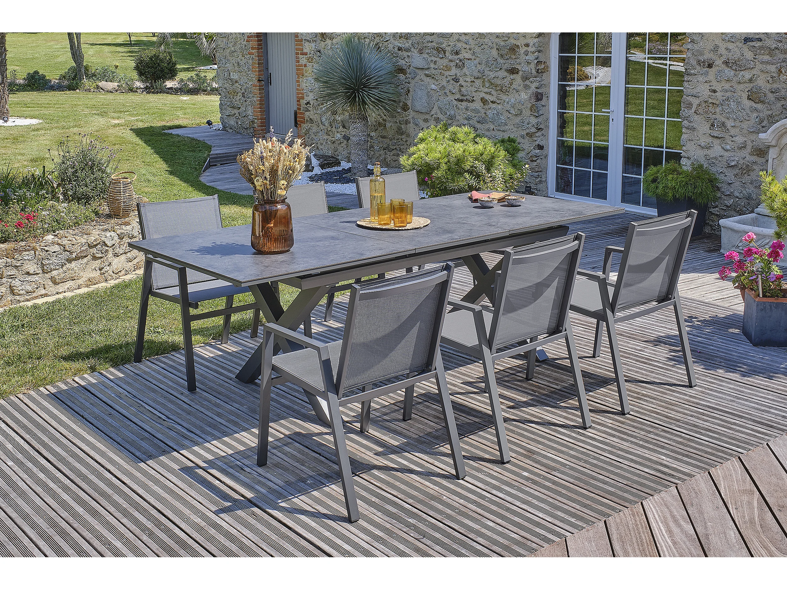 Conjunto de jantar de jardim com 6 lugares com tampo de cerâmica sobre vidro