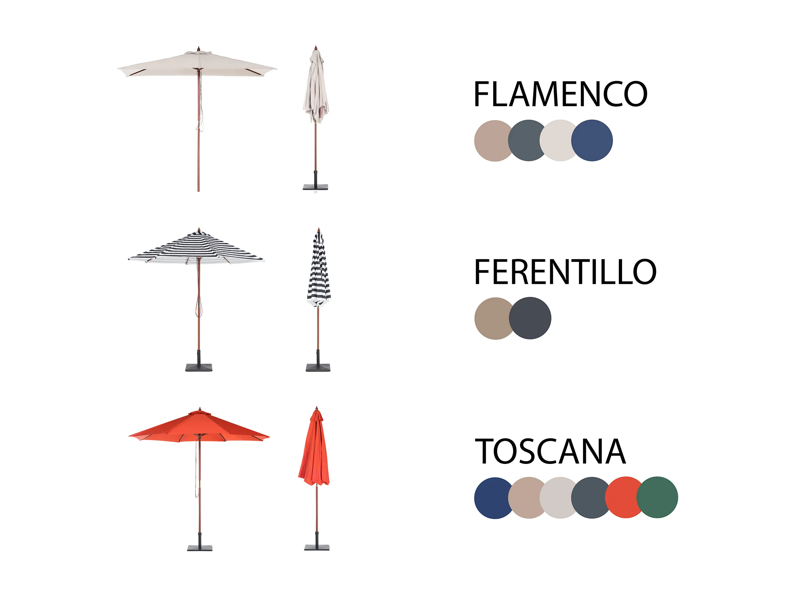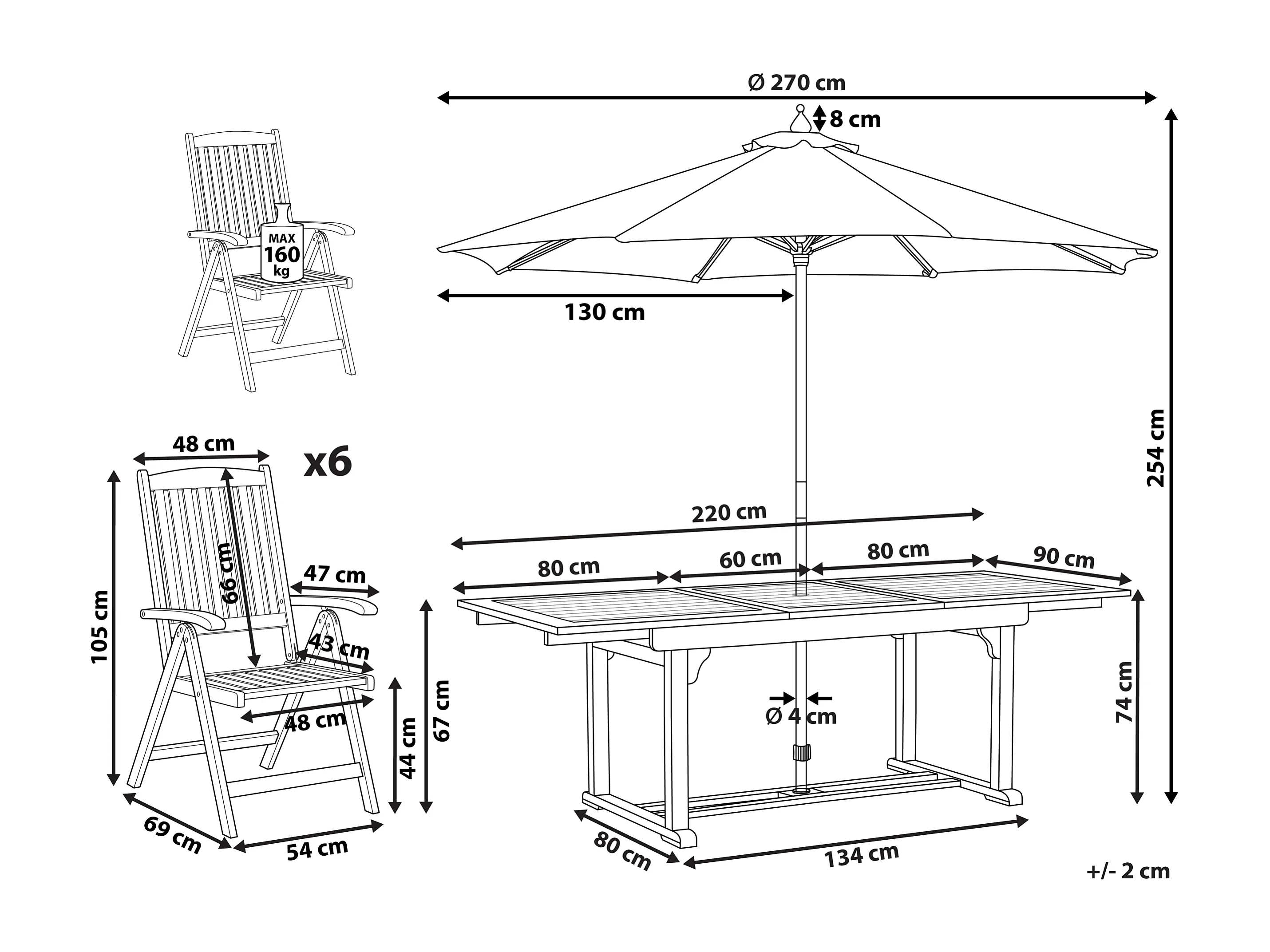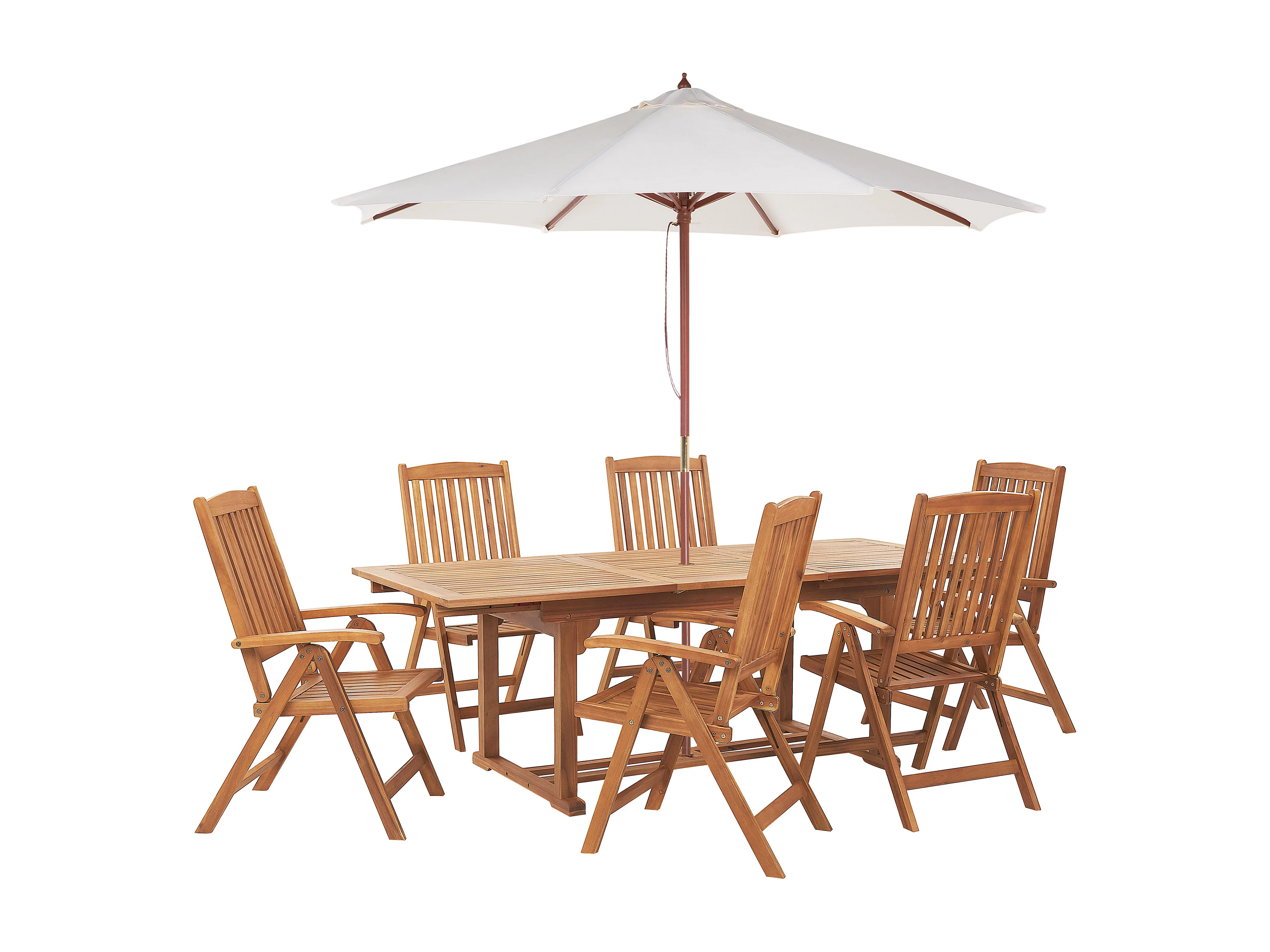 Conjunto de refeições de jardim 6 lugares JAVA com guarda-sol (12 opções) Madeira de acácia Castanho claro