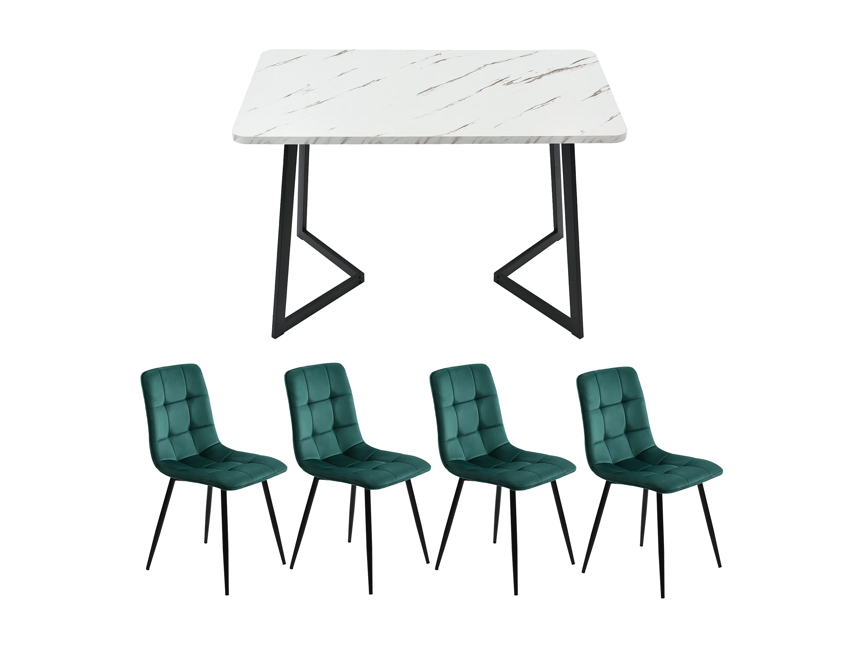 Conjunto de sala de jantar de 5 peças, mesa de MDF com efeito mármore de 117 x 68 cm, pernas de metal, cadeiras de veludo verde