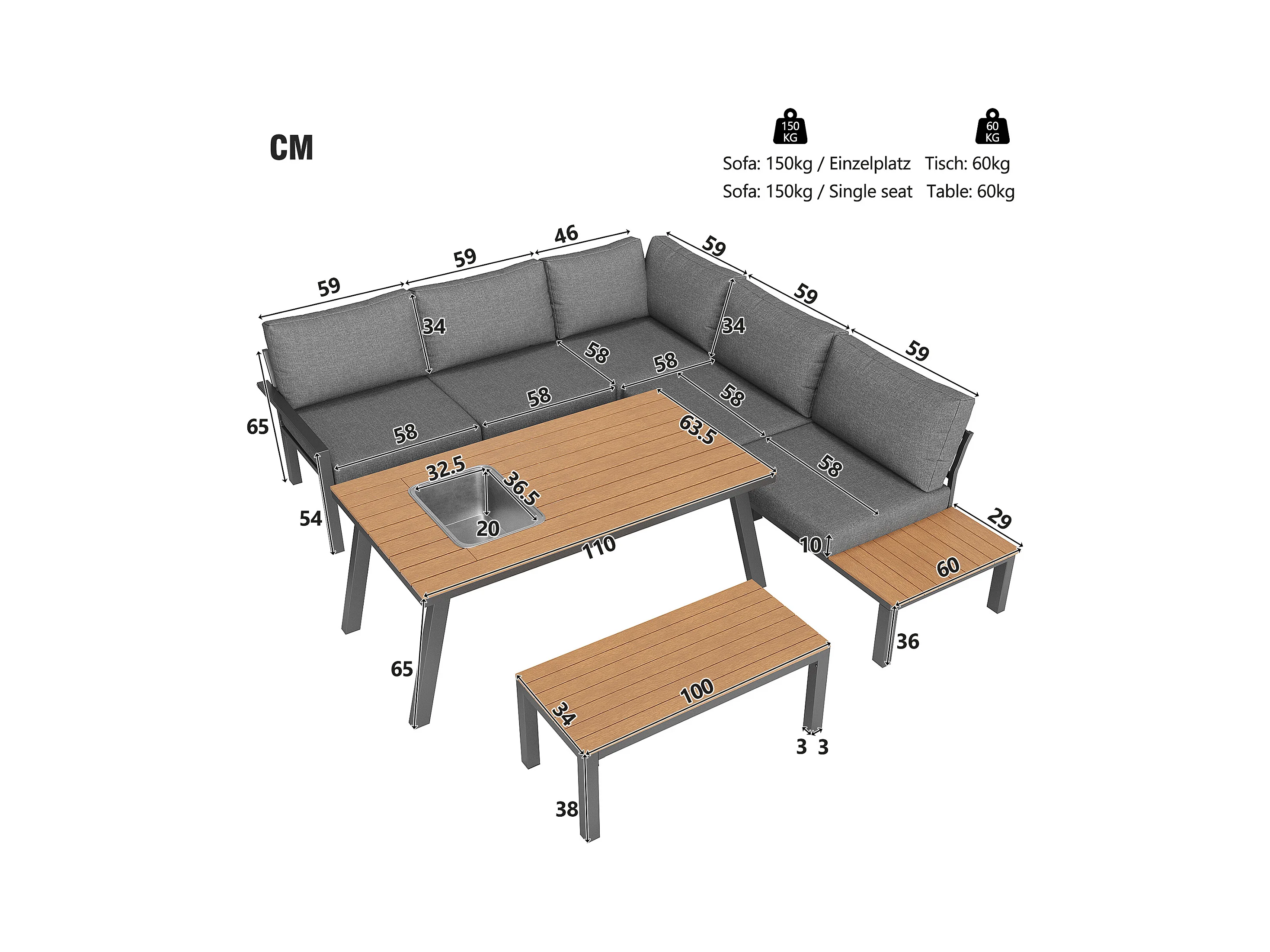 Conjunto de sala de jantar de jardim para 6-7 pessoas - estrutura em ferro galvanizado - com 1 mesa - tampo de mesa com balde de gelo - Cinza